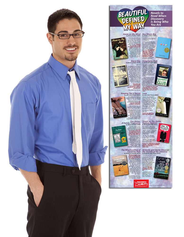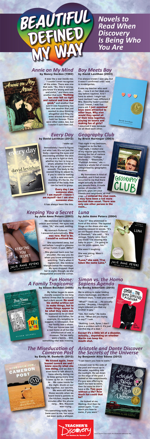 Encourage acceptance and excite your students about reading with this young adult novel poster with LGBT themes! Each featured novel will affirm the LGBT experience and widen your students’ perspective as they read about each character’s journey of self-discovery and acceptance. After reading the preview text from 10 novels, your students will be longing to pick up the book and discover what happens next. This poster is a perfect addition to your classroom library or reader’s workshop.