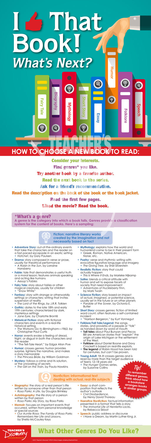 When your students ask, "What should I read next?" simply point them to the tips for choosing a new book on this poster.