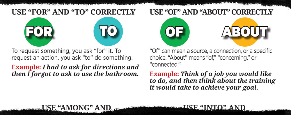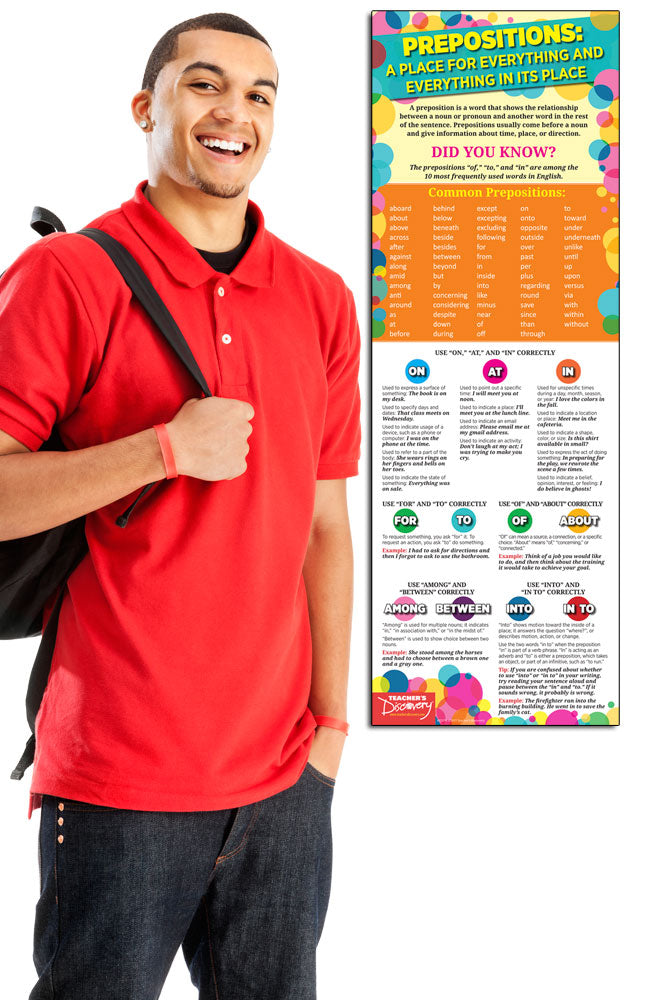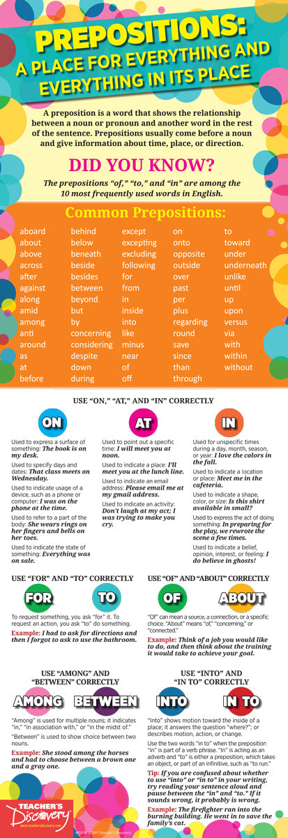 Prepositions put things in their place. A colorful list and useful examples help students know and remember how to use them correctly.