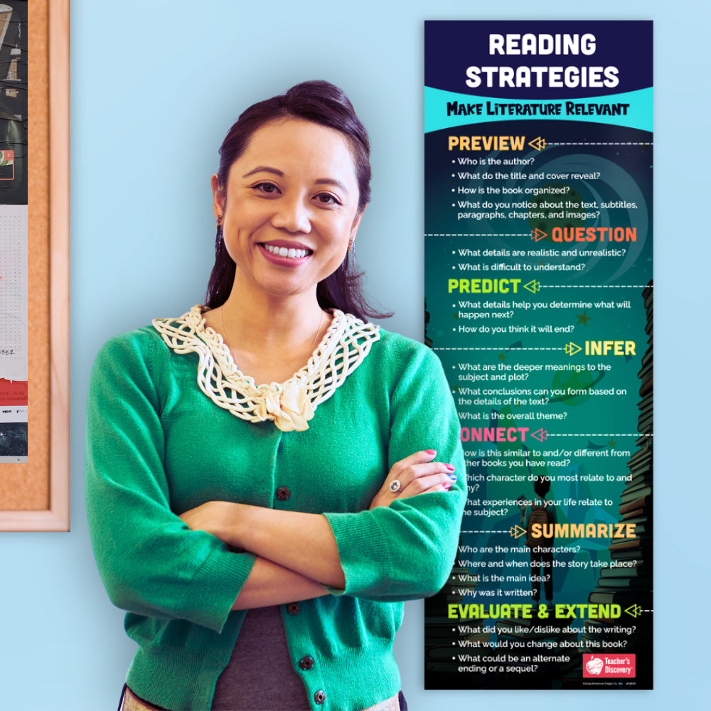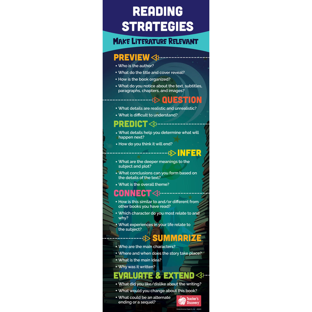 Preview, Question, Predict, Infer, Connect, Summarize, and Evaluate & Extend. This classroom poster features key reading comprehension strategies with corresponding questions for students to consider before, during, and after they read literature. The result is an engaged and connected reader with a deeper understanding of literary texts.
