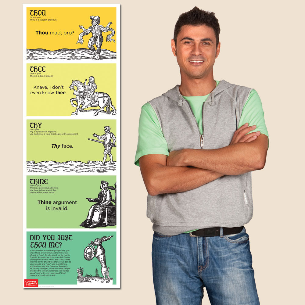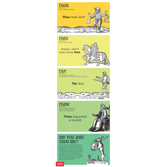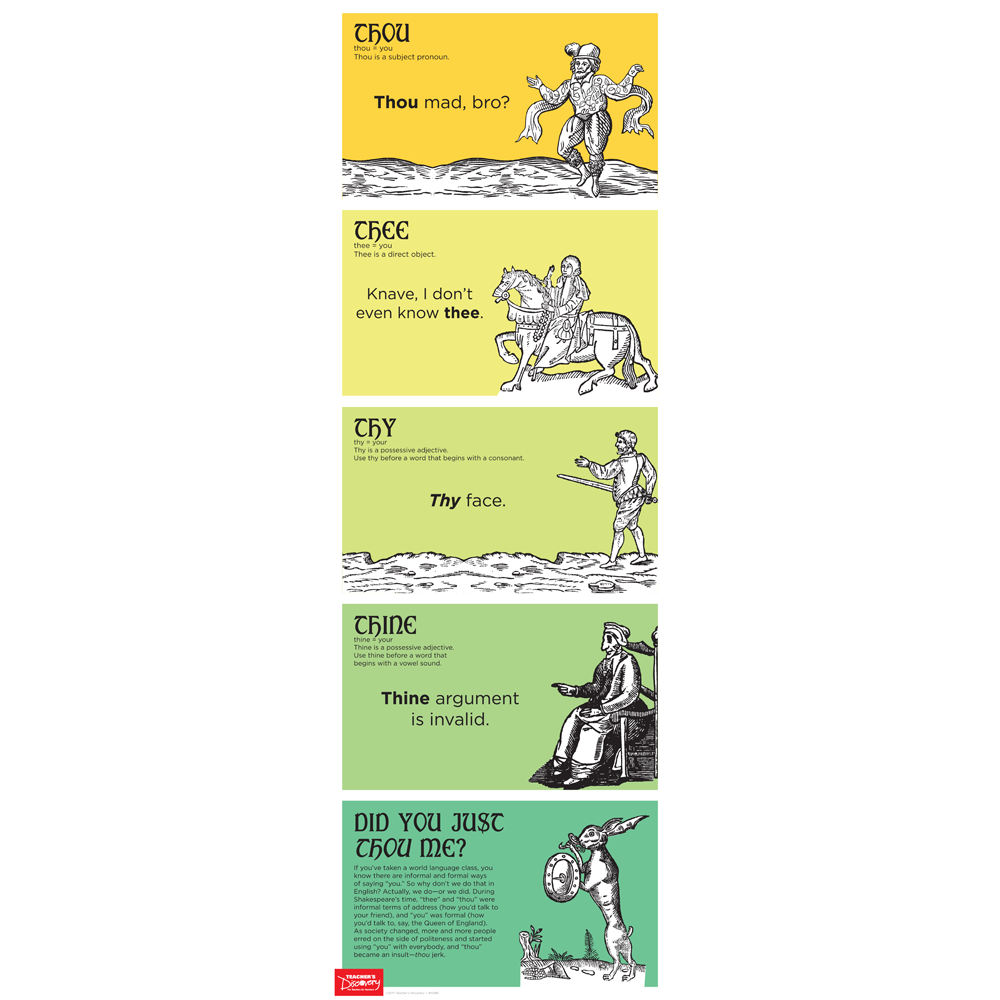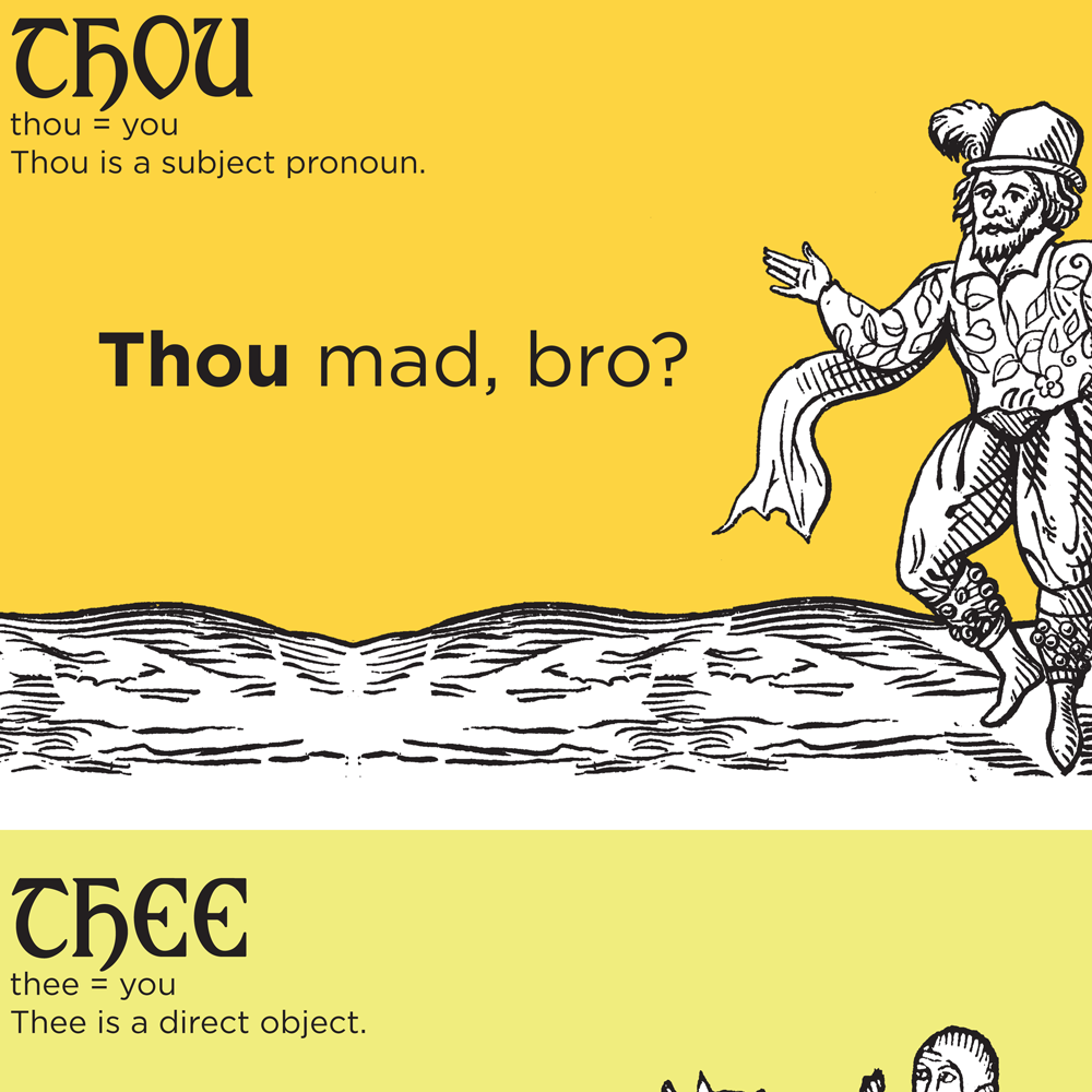 Relate to students with a meme showing the correct usage of thou, thee, thy, and thine.