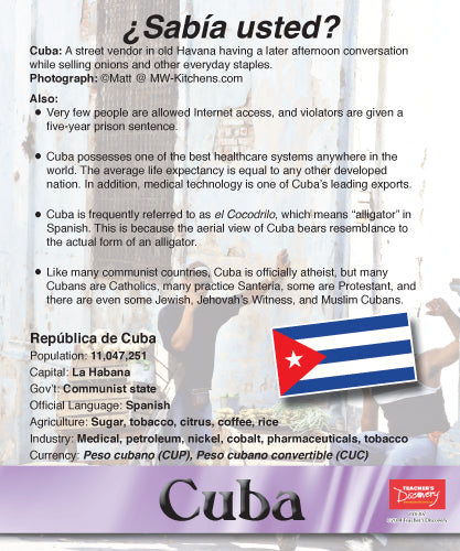 Each of the 21 Spanish-speaking countries is represented with large, real photographs of life and sights. ¿Sabía usted? cards have facts such as currency, population, capital, national flag, and more.