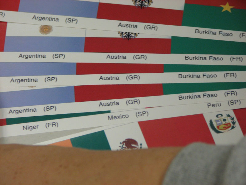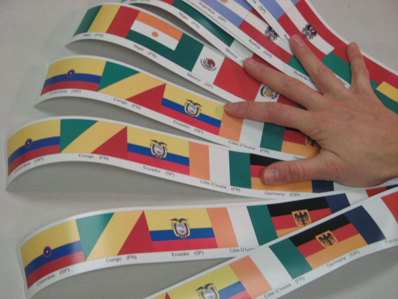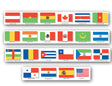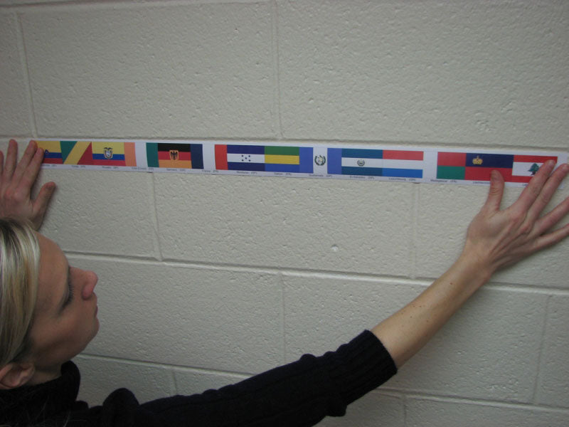 Thirty-nine feet of borders depicting 42 different country flags. Border is two inches wide. Each flag is labeled with the country name and language spoken (Spanish/French/German).