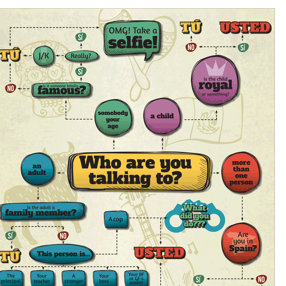 This flowchart tells your students which pronoun to use and when! Whether it’s someone totally famous (OMG selfie!) or an officer of the law (What did you do?!), students will always know what to say! ©2015. 19 x 27 inches. Laminated.