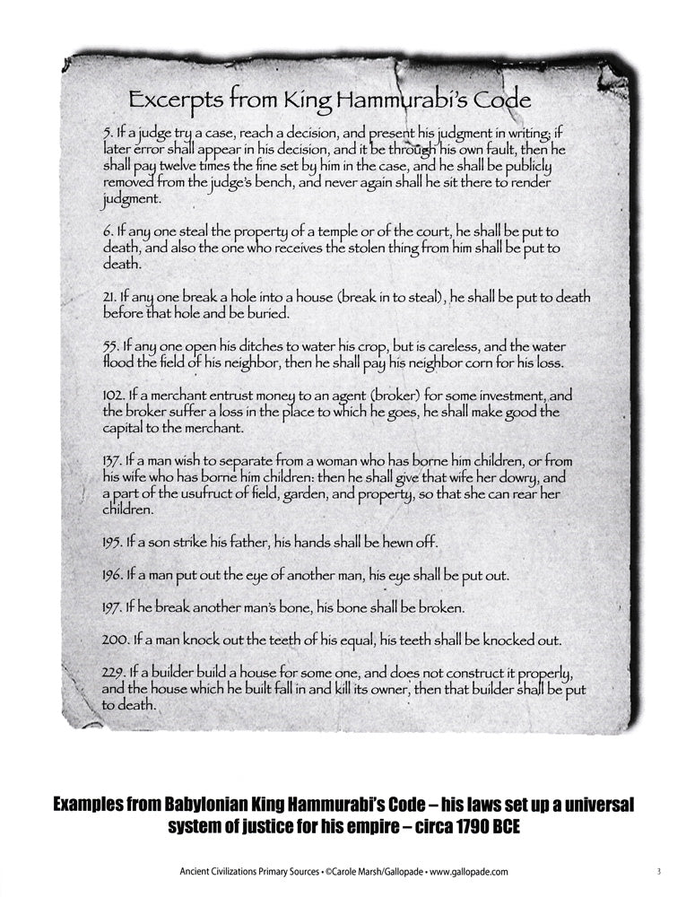 - Examples from Babylonian King Hammurabi’s Code—his laws set up a universal system of justice for his empire – circa 1790 BCE.