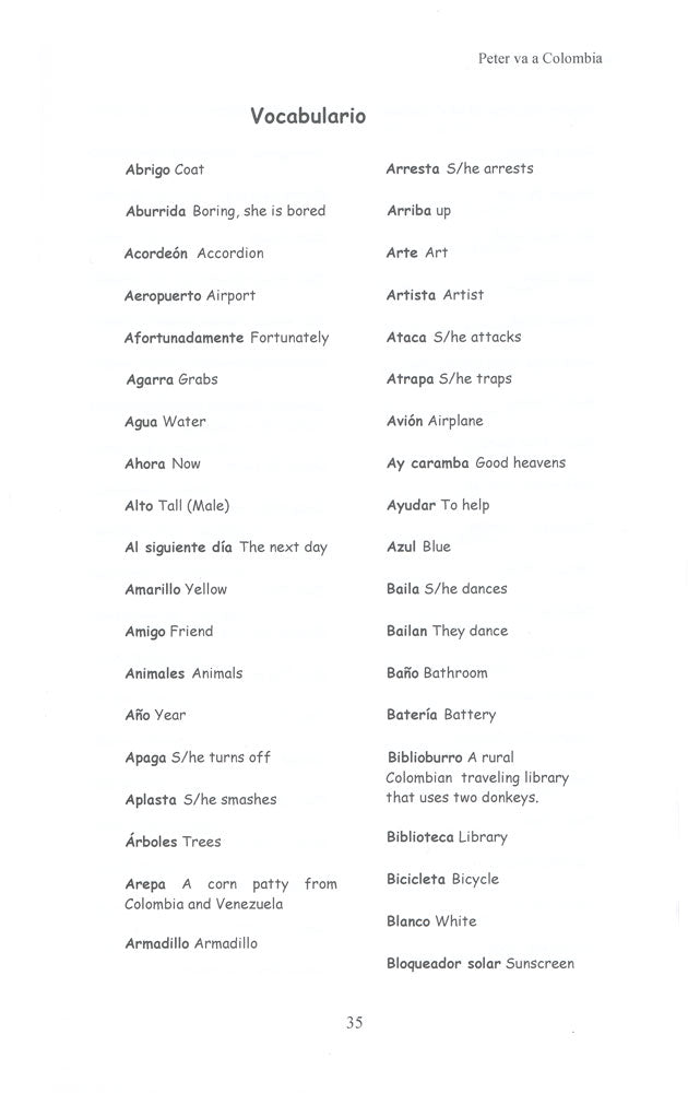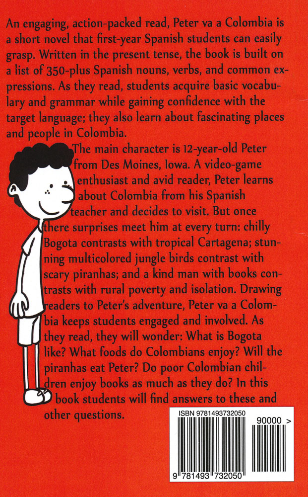 Twelve-year-old Peter travels to Colombia where he discovers wild climates, amazing creatures, and the real people of this vibrant country. Written in present tense, this first-year reader contains just 350 Spanish nouns, verbs, and common expressions. Includes a section to encourage deeper learning, plus a glossary of terms.