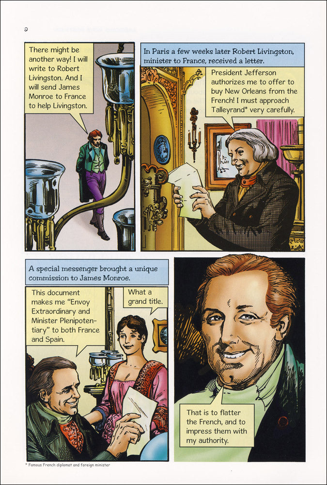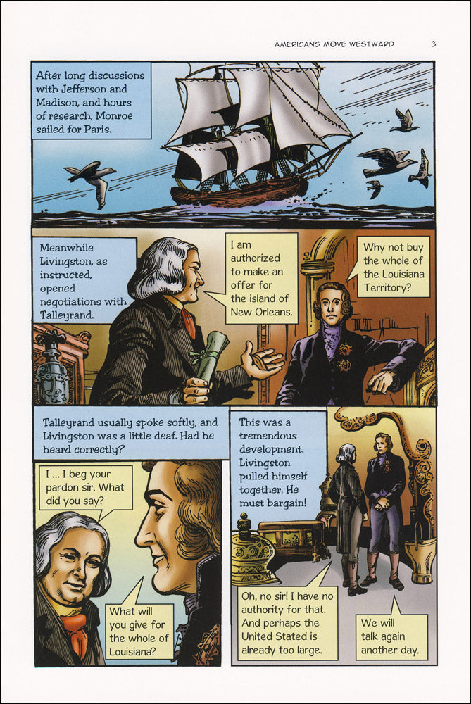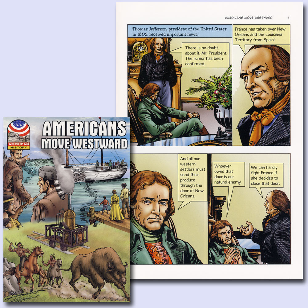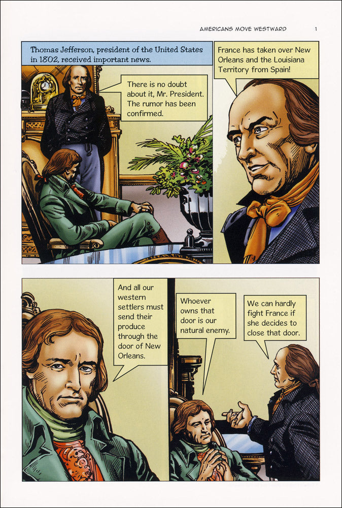 History is a story. See it brought to life in this graphic narrative about 50 years beginning with the Louisiana Purchase and spanning across Lewis and Clark’s expedition, the construction of the first American railroad, and the end of joint occupation. Your students will experience the period through realistic renderings of famous historical figures, including Thomas Jefferson, James Monroe, and Robert Livingston. Natural dialogue along with narrative text provides readers two simultaneous yet different perspectives of pivotal events in American history.