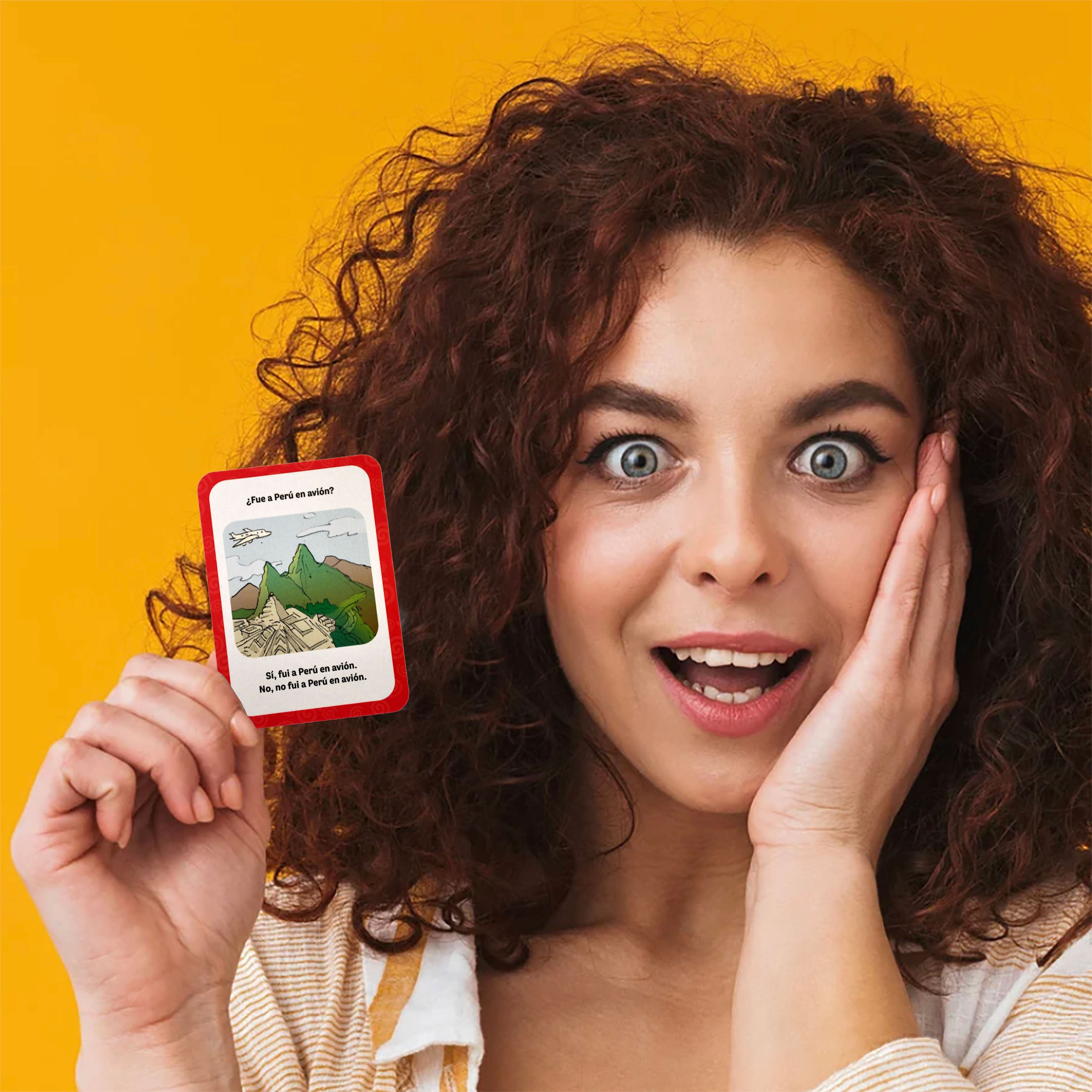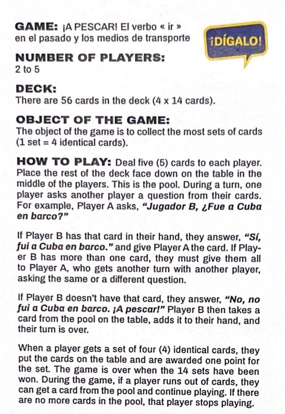 Card game based on the "Go Fish" concept. Thirteen expressions are used and repeated with the verb ir in the pretérito and means of transportation, e.g., ¿Fue a Perú en avión?