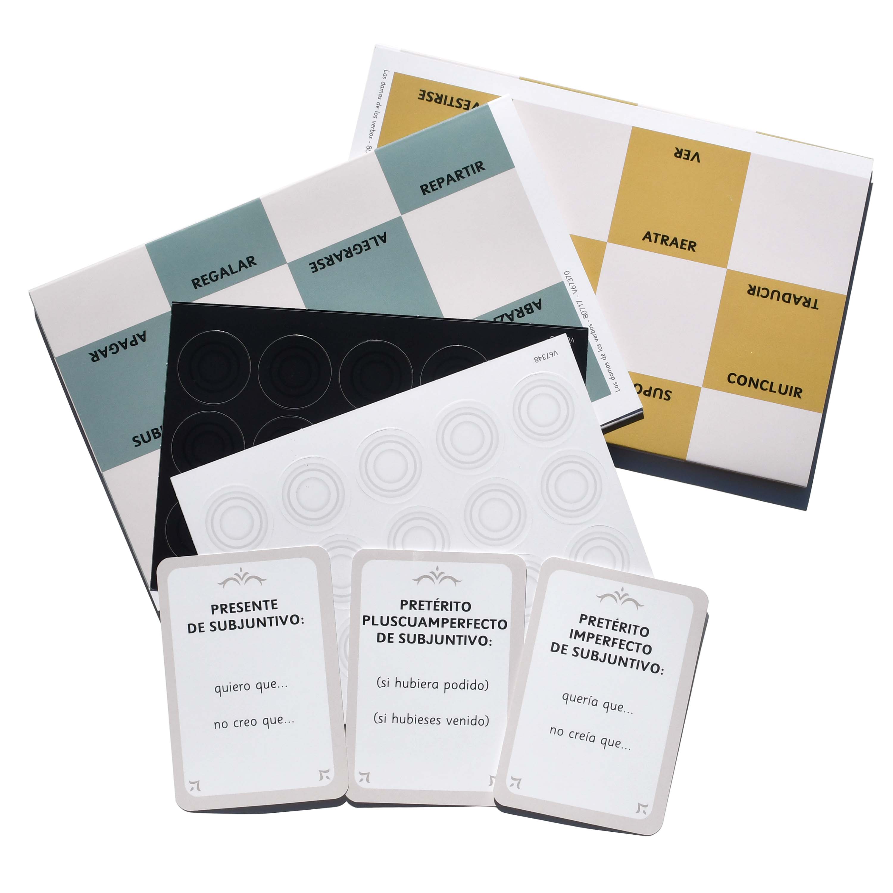 The game contains 2 game boards with 4 checkerboards (varying the difficulty of the verbs), 30 black and 30 white game pieces, 9 cards with personal pronouns as subjects, and 11 cards with information on the verb forms.