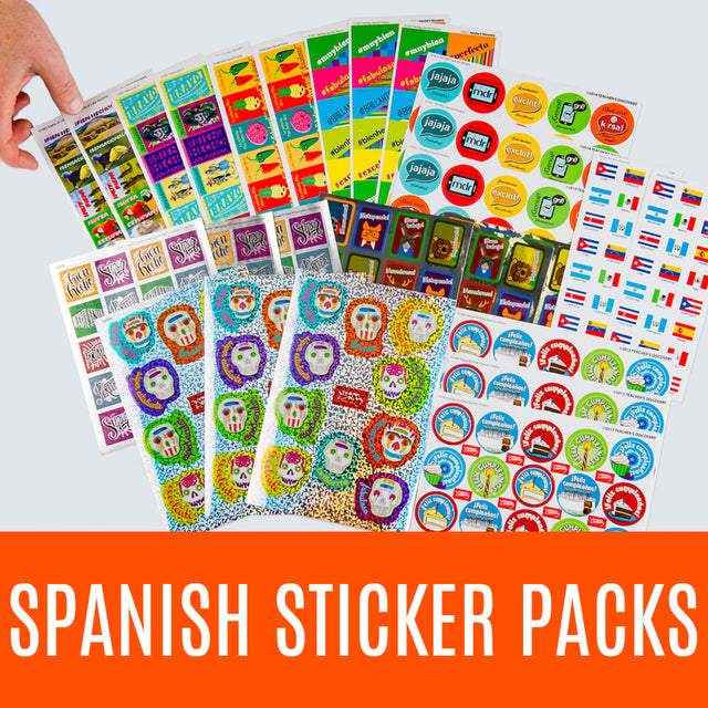 The variety of styles in this value pack will have your Spanish students starting collections on their folders and notebooks! You'll have stickers for the whole year! Don't worry if you love them so much you manage to run out, we've got more! Order 1E0541 for 1500 stickers or 1E1729 for 750 stickers. Assortment contains at least 10 different styles. Styles vary, most stickers measure about 1 inch across.