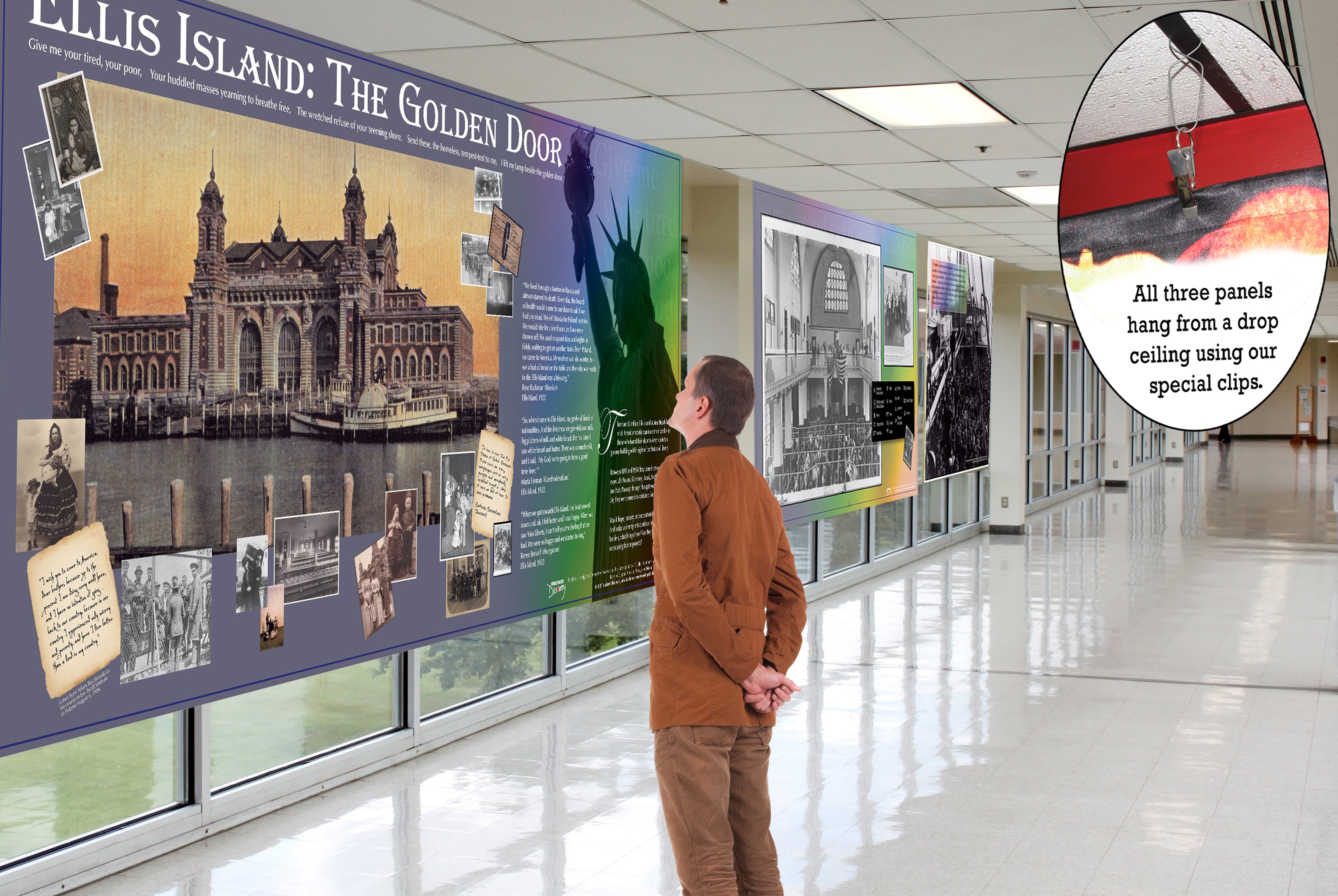Brightly colored images on lightweight satin fabric are easy to install (hardware included) on any drop ceiling. Set includes 3 pieces (7 feet by 17 feet, 4 feet by 8 feet, and 4 feet by 4 feet) and features photographs and quotes from Ellis Island immigrants.