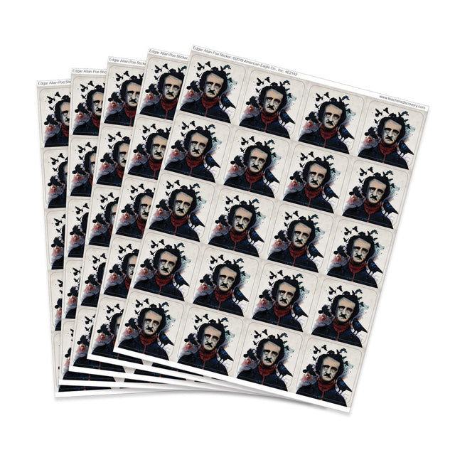 One hundred Edgar Allan Poe stickers—great for incentives or for yourself! Five sheets of 20 full-color stickers in a unique watercolor design. Each square sticker measures 1.25 x 1.25 inches. ©2019.