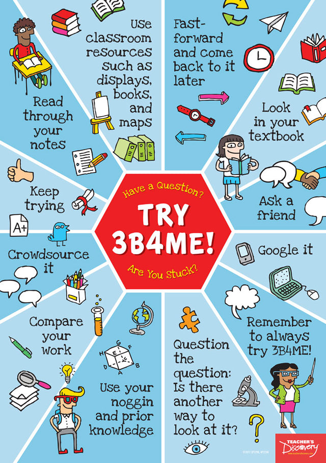 - Use this poster as a regular reminder for students to try three other avenues before coming to you!