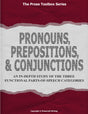 Pronoun lessons cover possessive and demonstrative pronouns, pronoun reference, antecedents, and reflexive pronouns. Preposition lessons cover phrasal prepositions and prepositional phrases. Conjunction lessons cover conjunctive adverbs and coordinating, correlative, and subordinate conjunctions.