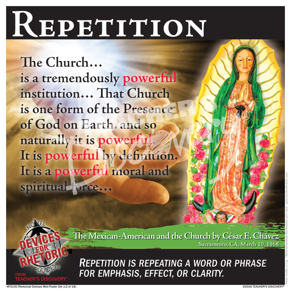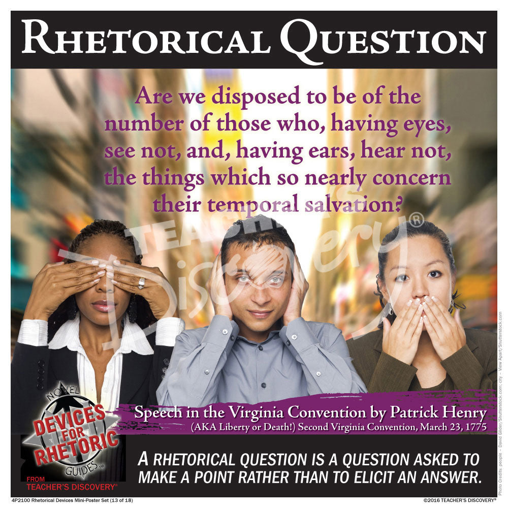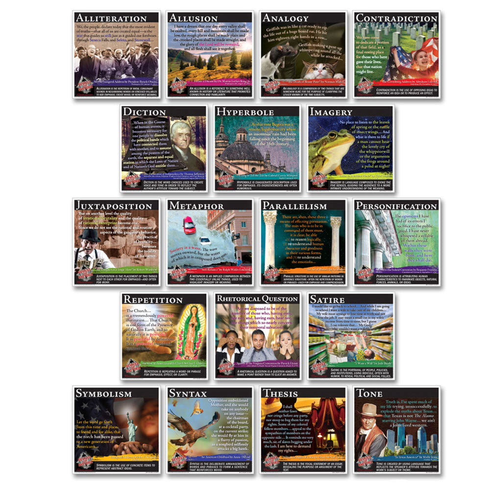 Each of the 18 posters in the set lists a device used for rhetoric, its definition, and a quote from a rhetorical text.