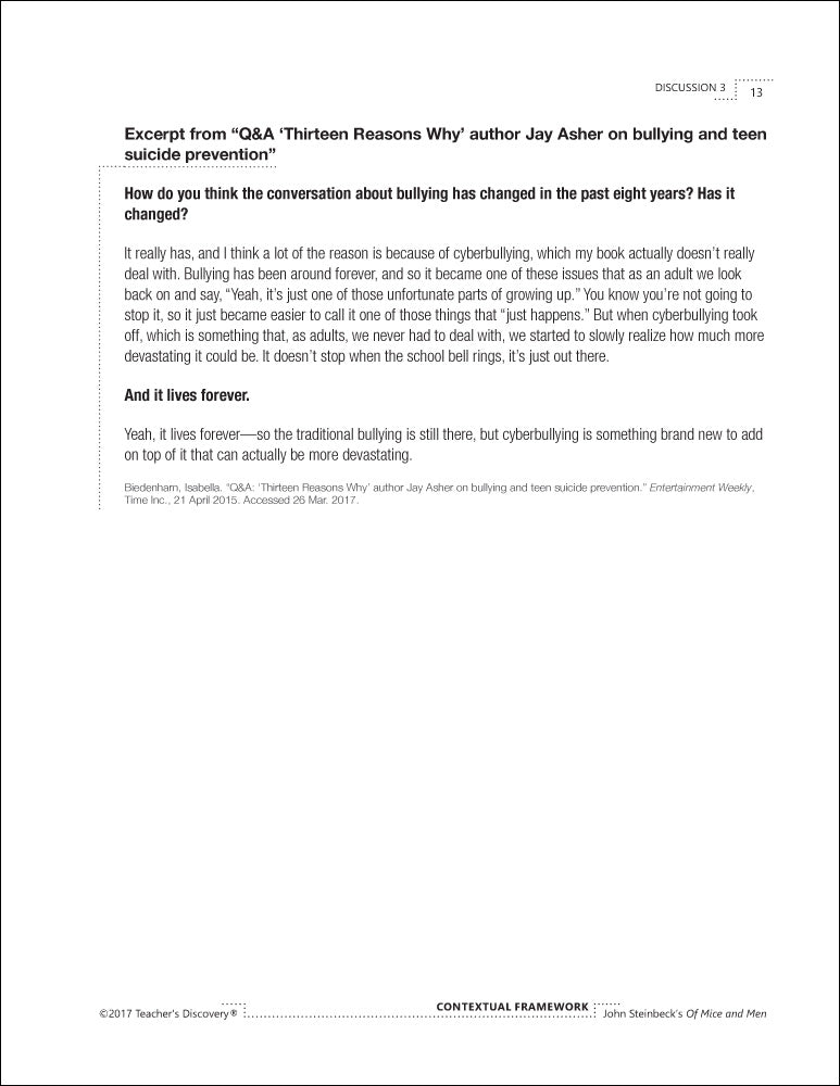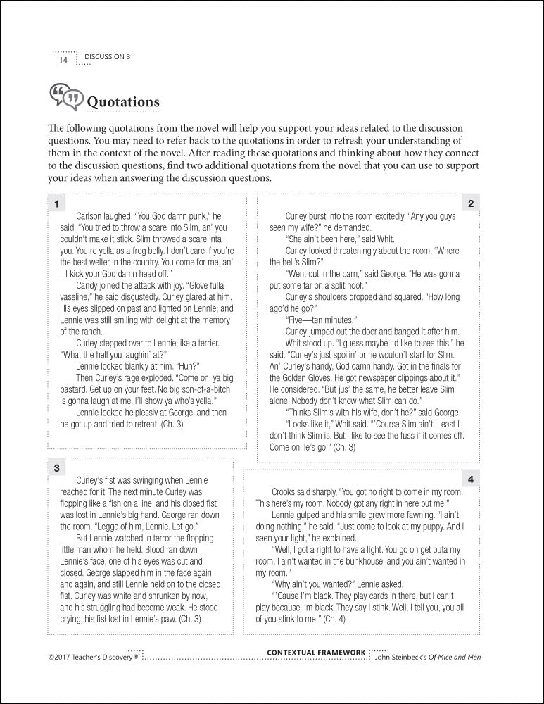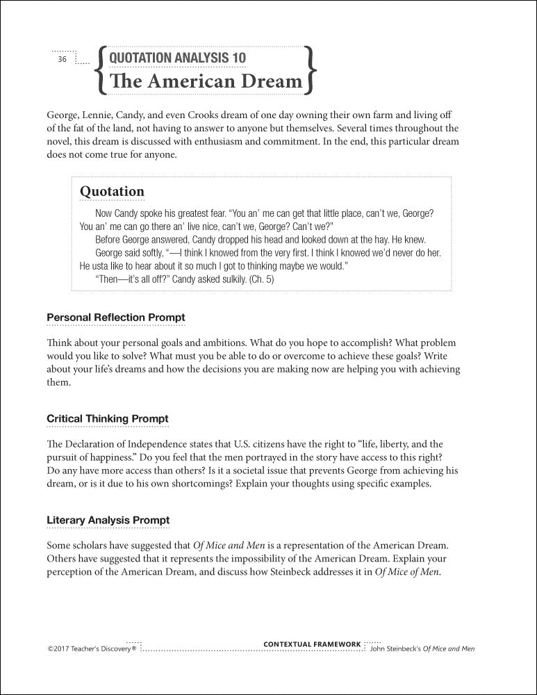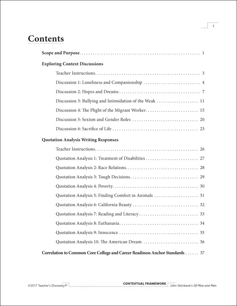 How might loneliness or the fear of it motivate or influence a person’s choices? What happens when a person is forced to give up on their dreams? What makes the migrant lifestyle difficult? What parallels exist between the expectations and actions of women portrayed in the resources and modern society? Context-based questions give students the framework for a deeper analysis and understanding of John Steinbeck’s Of Mice and Men.