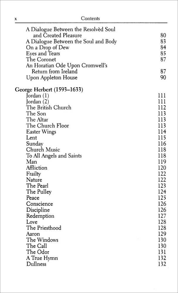 This anthology contains the best work by major poets of the school: John Donne, Andrew Marvell, George Herbert, Henry Vaughan, Richard Crashaw, and Thomas Traherne, all of whose works were originally considered a reaction against traditional Elizabethan verse of the late sixteenth century. Included are Donne’s The Good Morrow and Death, Be Not Proud; Marvell’s The Garden and To His Coy Mistress; Herbert’s Easter Wings; Vaughan’s The World; and many more.