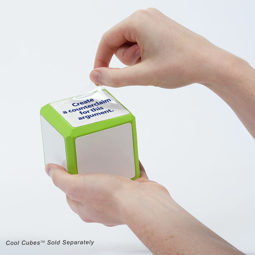 Prompt students with ELA clings! After reading a text, students roll the dice and answer the prompt that pops up. Perfect for spicing up your lessons and engaging students. Use individually or with groups. Each reusable prompt cling fits perfectly on three-inch Erasable Cool Cubes. Each set includes 48 clings—24 literary text prompts and 24 informational text prompts. The complete set will fit on a total of eight 6-sided cubes (equals two sets of 3-inch Cool Cubes).