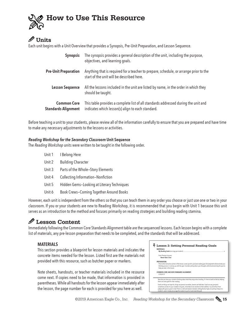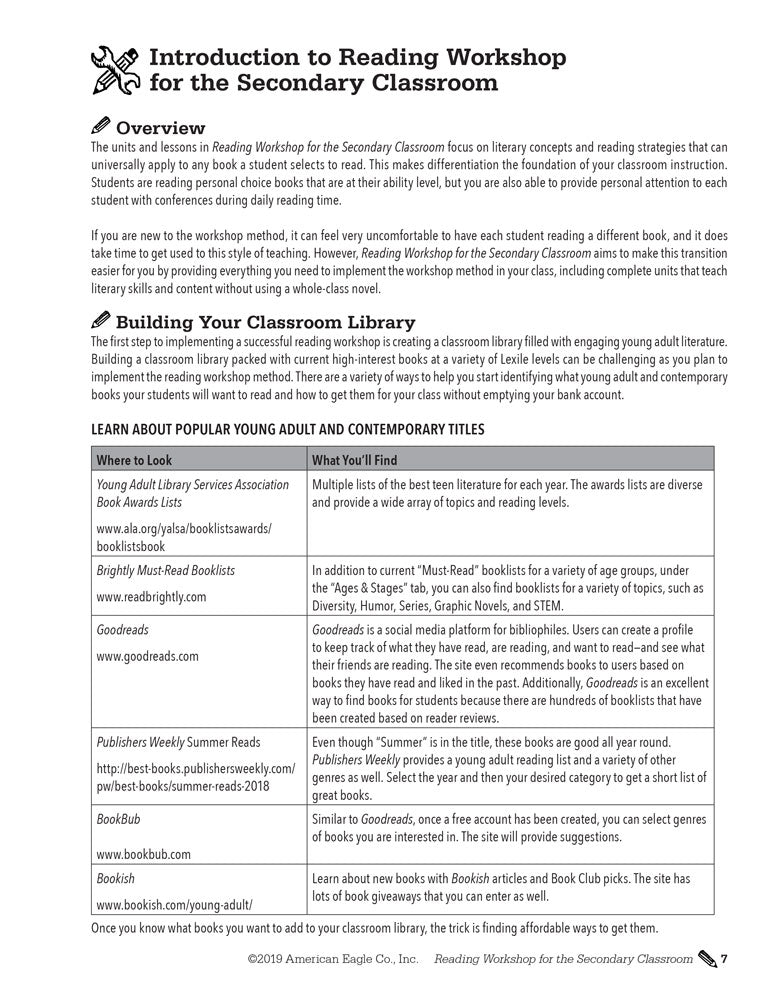 Transition to the reading workshop method TODAY using the Reading Workshop for the Secondary Classroom curriculum. The six included units—complete with lessons, handouts, and activities—provide you with everything you need to teach the literary concepts and reading strategies required by the standards. All lessons universally apply to any book your students may choose to read.