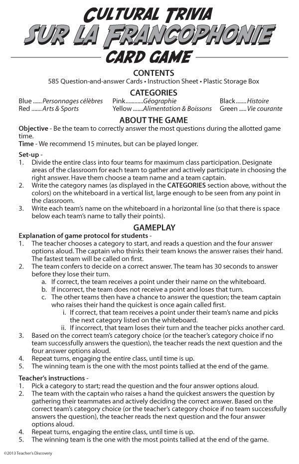 Cultural Trivia Game Sur la Francophonie Game Cards