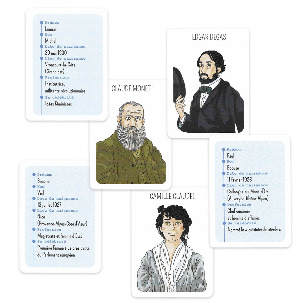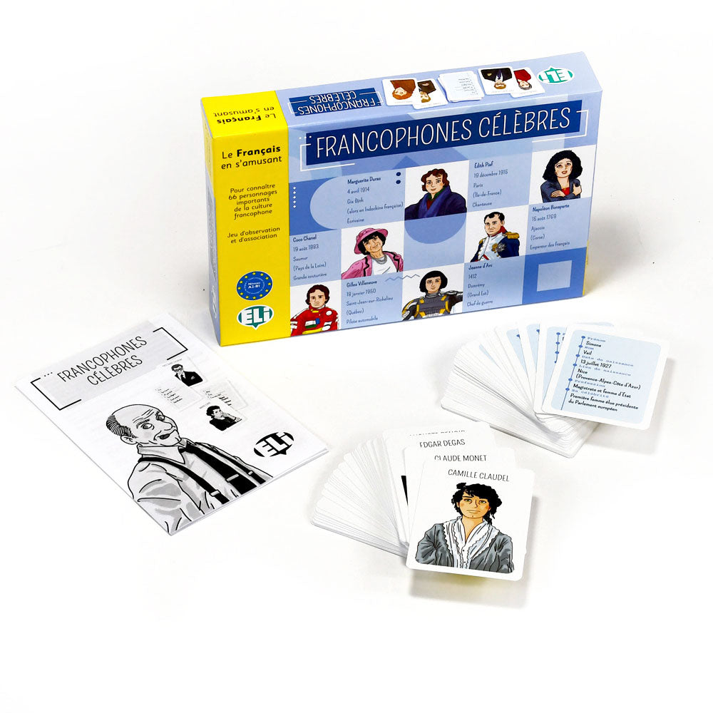 Famous Francophones is a very fun card game that consists of matching picture cards representing famous people from French-speaking culture with the corresponding identity cards. This game allows learners to acquire, memorize, and use, in a pleasant and playful way, information of frequent use in the French language to identify a character. Includes 66 illustrated portraits and 66 cards containing useful information to identify the characters.