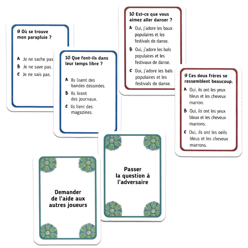 The game consists of 132 cards divided into two decks of different colors, 60 blue cards for verb forms and 60 red cards for other grammar points. Each card contains a numbered multiple-choice question with three options: A, B, and C. Only one answer is correct. There are also 12 green Lifeline (help) cards, 6 for each team.