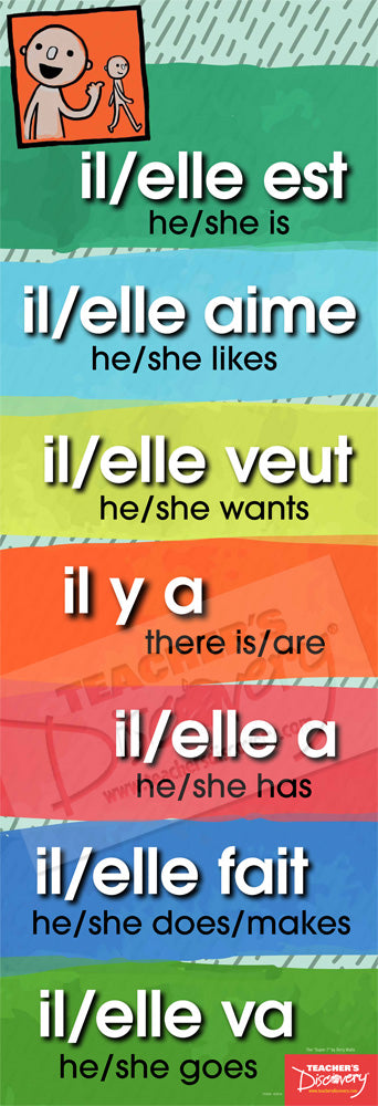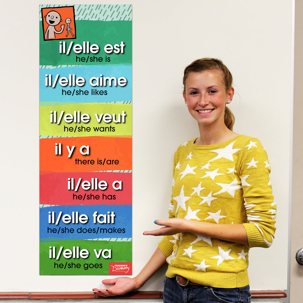 Expert TPRS/CI teacher Terry Waltz drew on her experience as a professional interpreter to boil storytelling down to its essence. The verbs on this poster express the seven basic concepts needed to tell a story: location, existence, possession, identity, preference, motion, and volition—shown here in the third person present tense. Focus on these early and often to get students comprehending simple stories in no time. 13 x 38 inches. Laminated.
