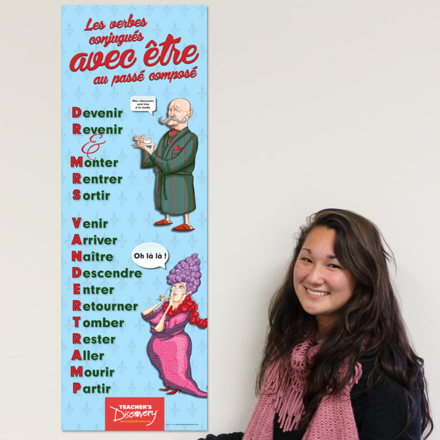 Remember the être verbs with these quirky characters! 13 x 38 inches. Laminated to last forever.