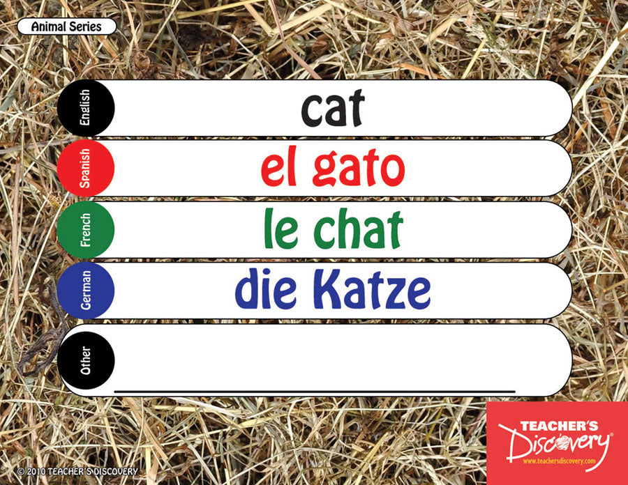 Flash cards with 32 topic-related vocabulary words. The flash cards are 6.5 x 5 inches with vocab in English, Spanish, French and German; plus a blank space to add your own language on the back. We've even included a reproducible study sheet for the students.