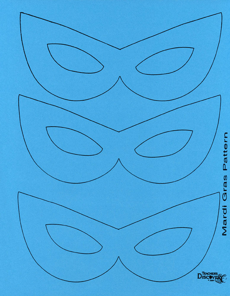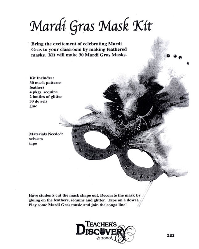 Students will love creating their own colorful masks for Mardi Gras. Kit includes everything you'll need for 30 masks: color cardstock printed with mask patterns, dowels, sequins, glitter, and glue. Makes a beautiful bulletin board display too! All levels.
