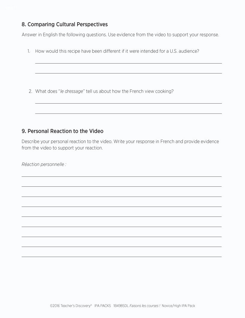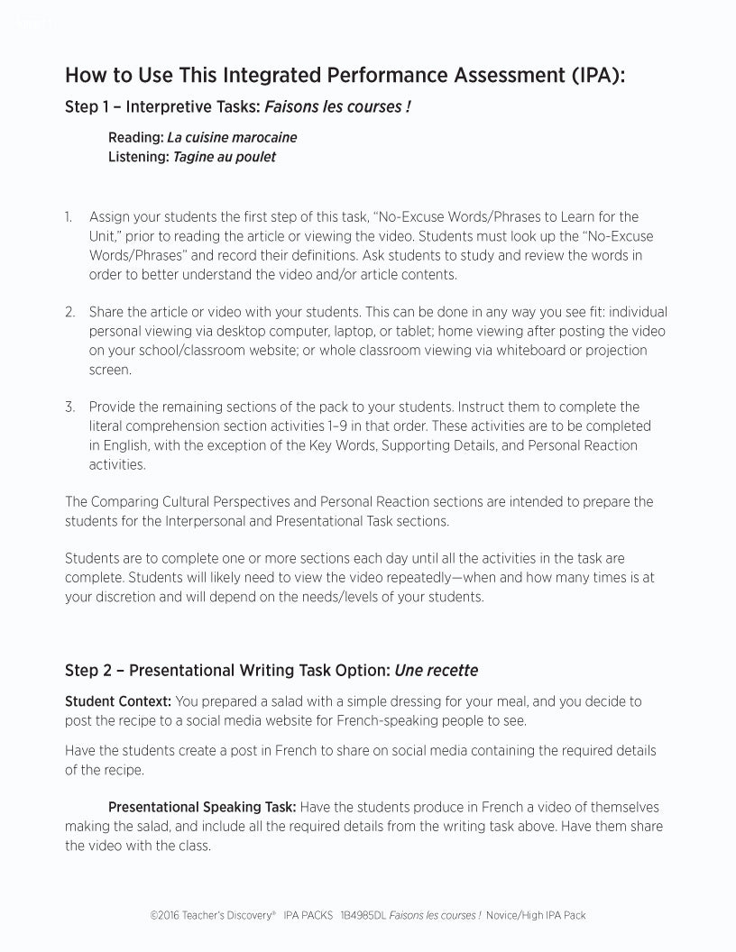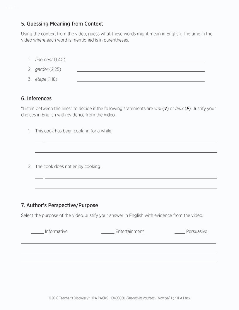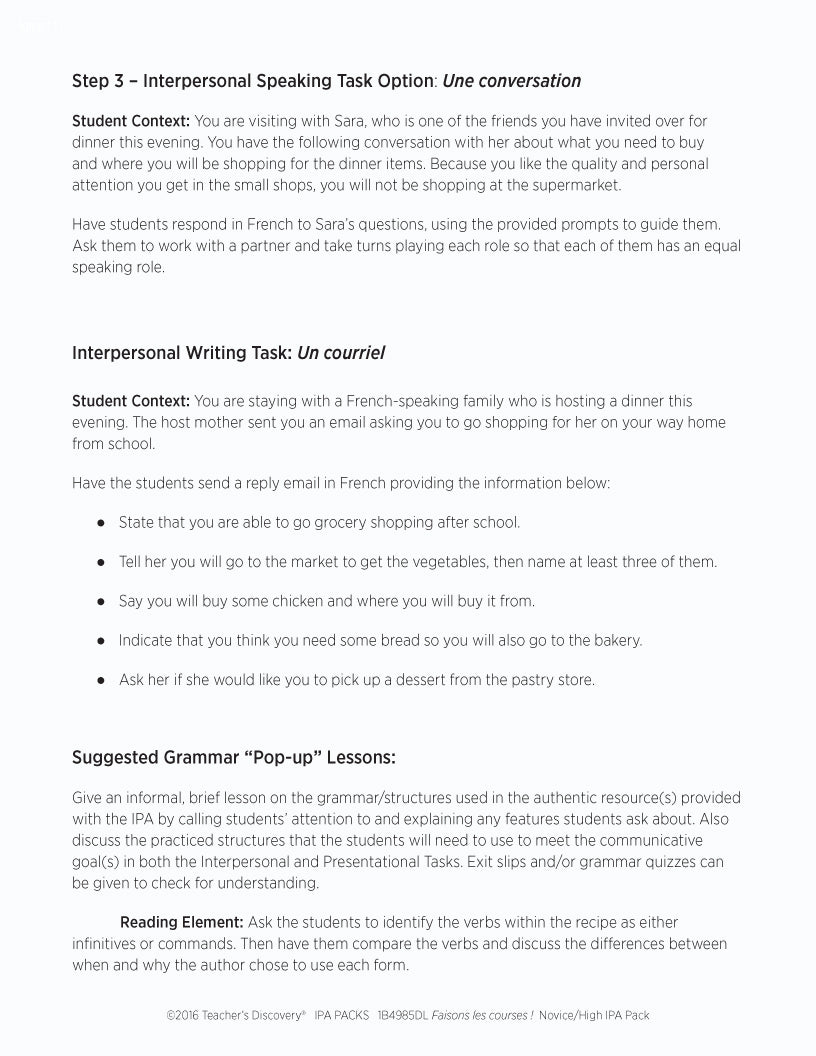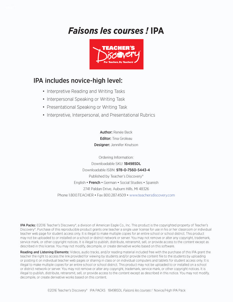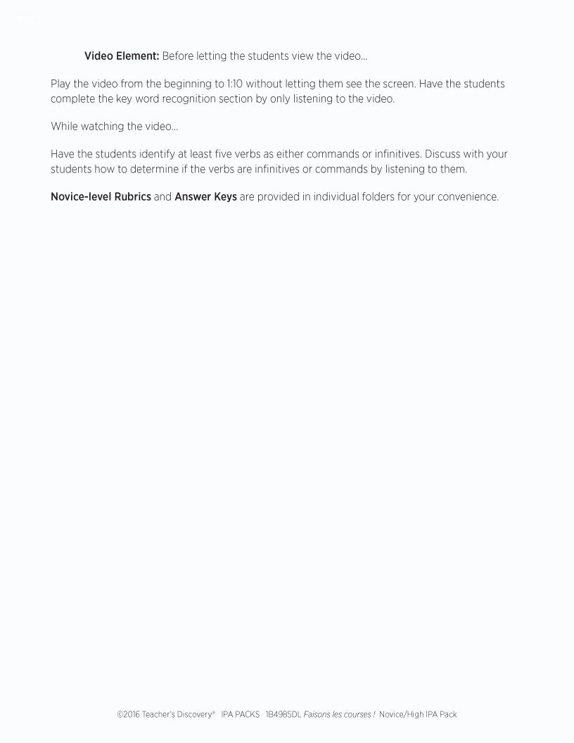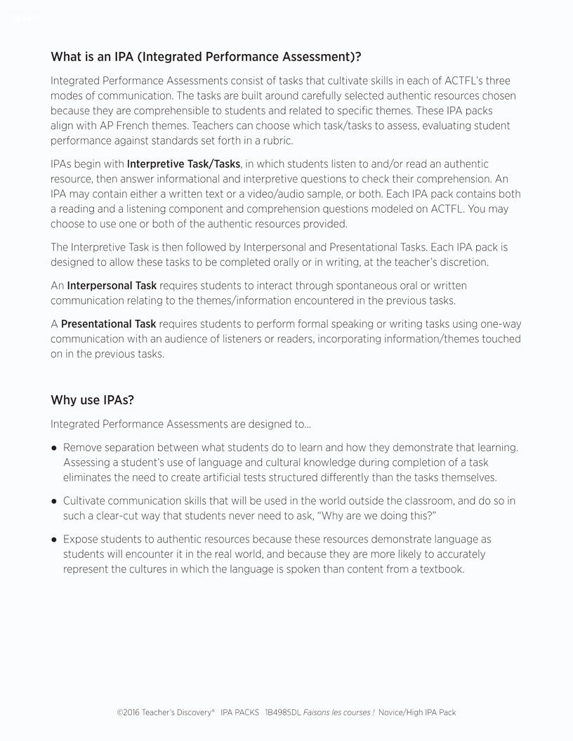 The pack includes step-by-step instructions, and reading and listening comprehension activities that follow the ACTFL model. Complete with an explanation of an IPA and how to use it, and nine Interpretive Tasks that break down the content, increase recognition of key words and phrases, develop context awareness, and promote language usage. In addition, it provides creative options for writing and/or speaking Interpersonal and Presentational Tasks, answer keys, and Novice/High level rubrics.