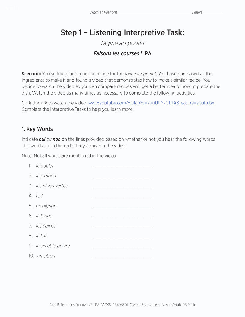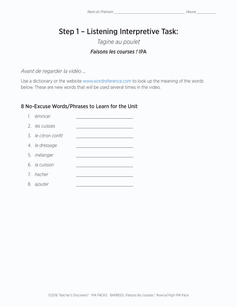 This IPA Pack download is based on two authentic resources: a recipe and cooking show style video that demonstrates how to prepare a traditional dish—chicken tagine with green olives and lemon—in 100% French.