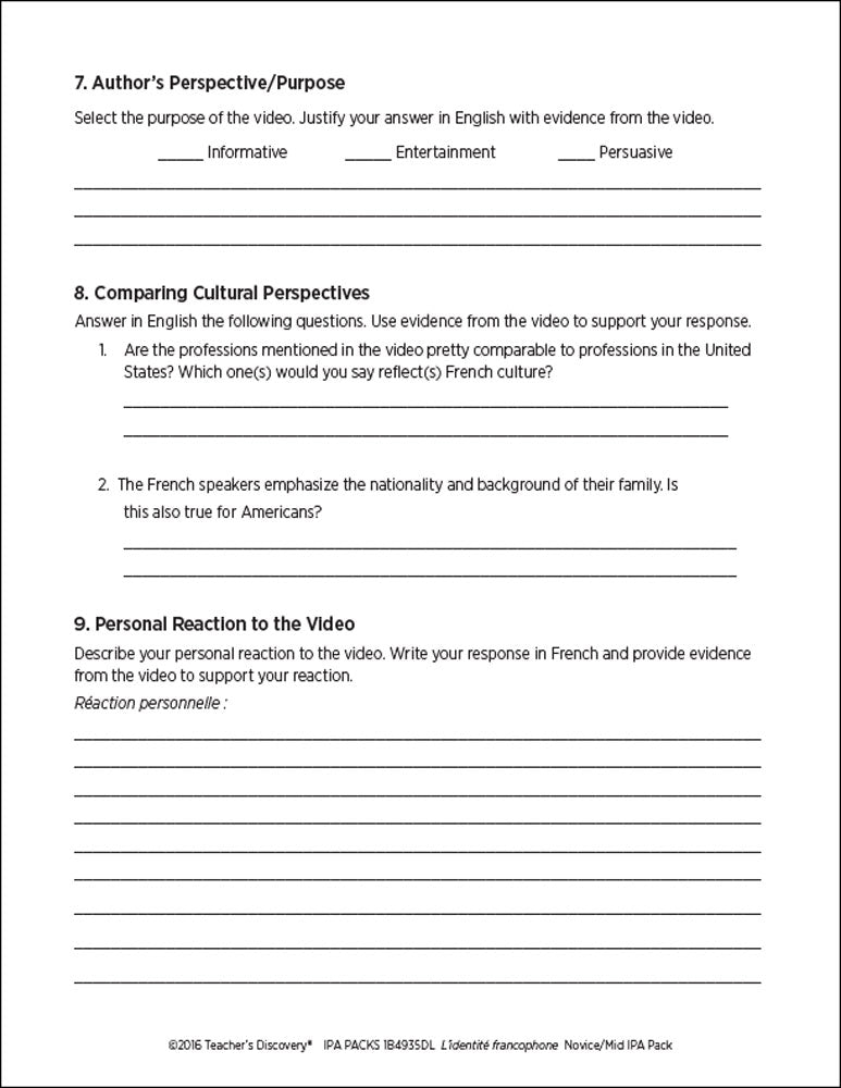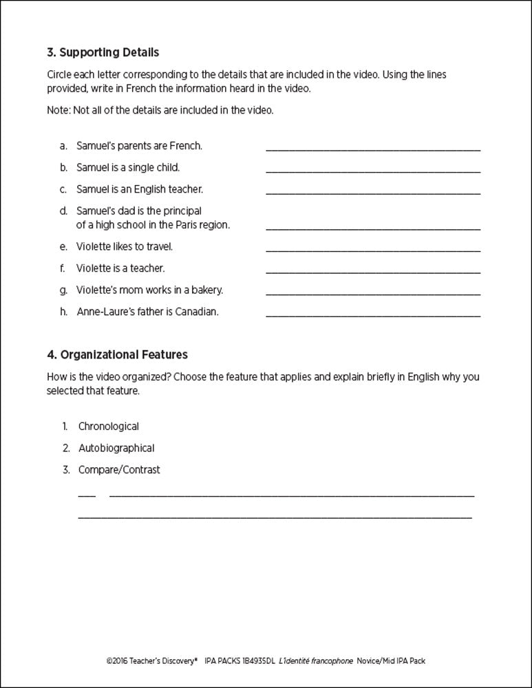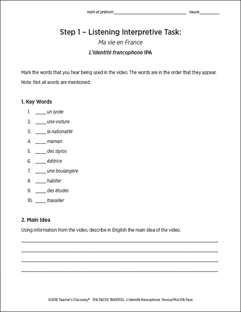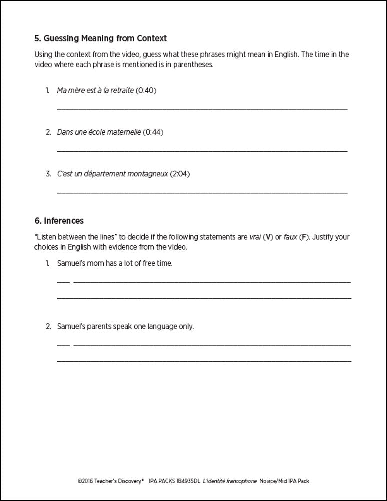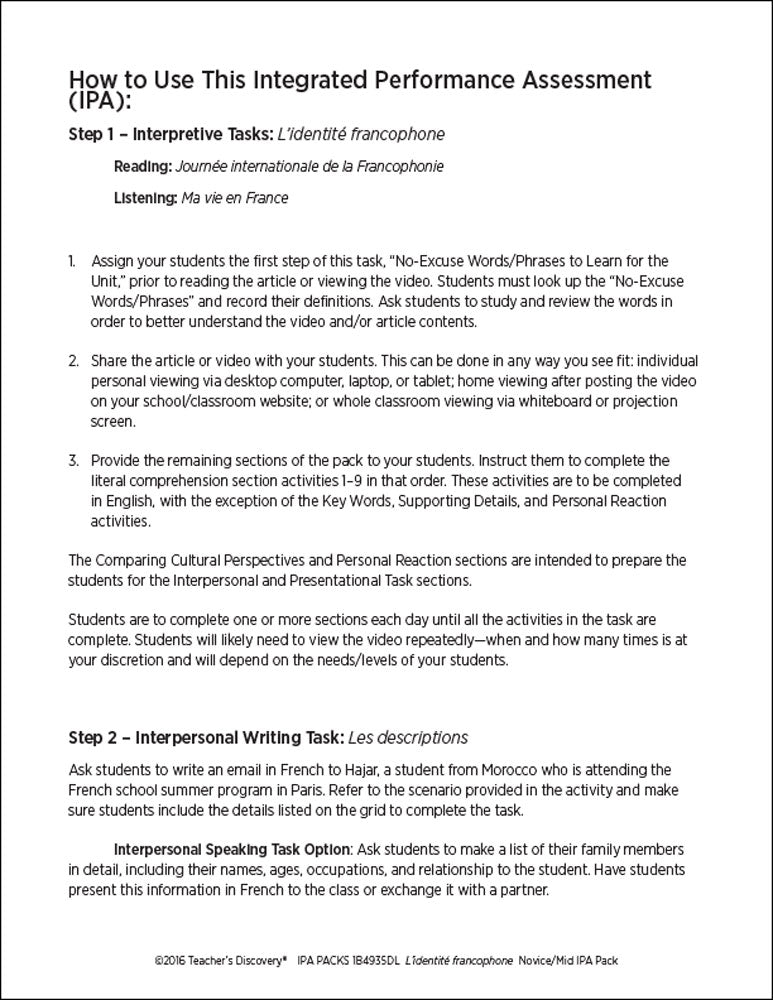 The pack includes step-by-step instructions, and reading and listening comprehension activities that follow the ACTFL model. Complete with an explanation of an IPA and how to use it, and nine Interpretive Tasks that break down the content, increase recognition of key words and phrases, develop context awareness, and promote language usage. In addition, it provides creative options for writing and/or speaking Interpersonal and Presentational Tasks, answer keys, and novice-level rubrics.