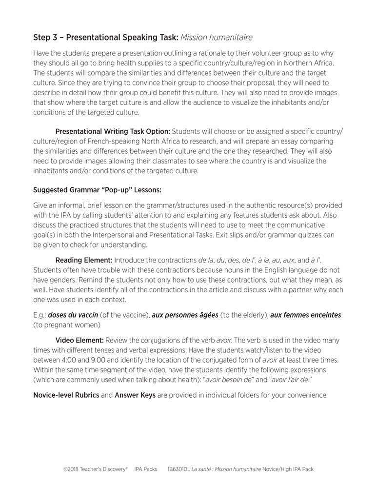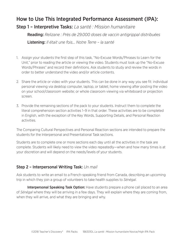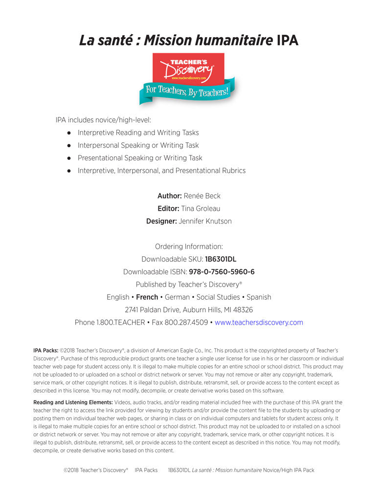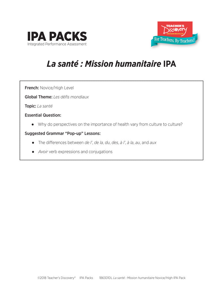 La santé : Mission humanitaire Novice-High French IPA Pack - DIGITAL RESOURCE DOWNLOAD