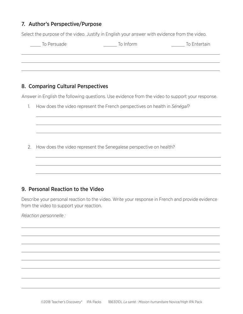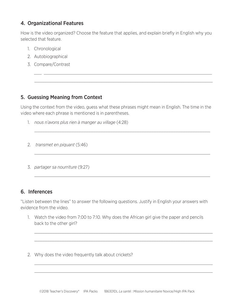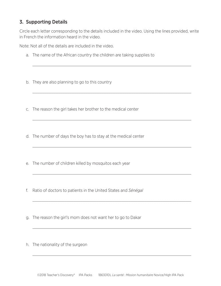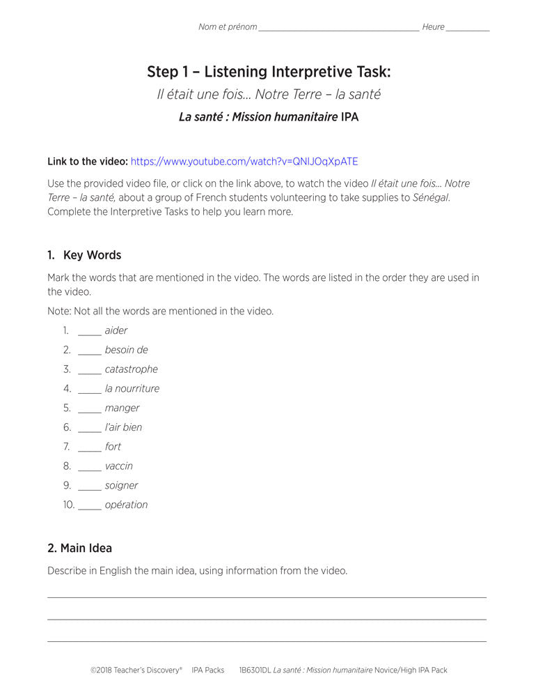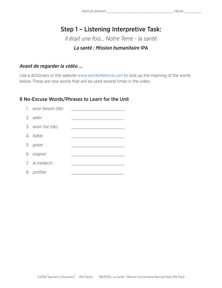 La santé : Mission humanitaire Novice-High French IPA Pack - DIGITAL RESOURCE DOWNLOAD