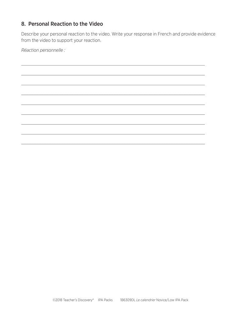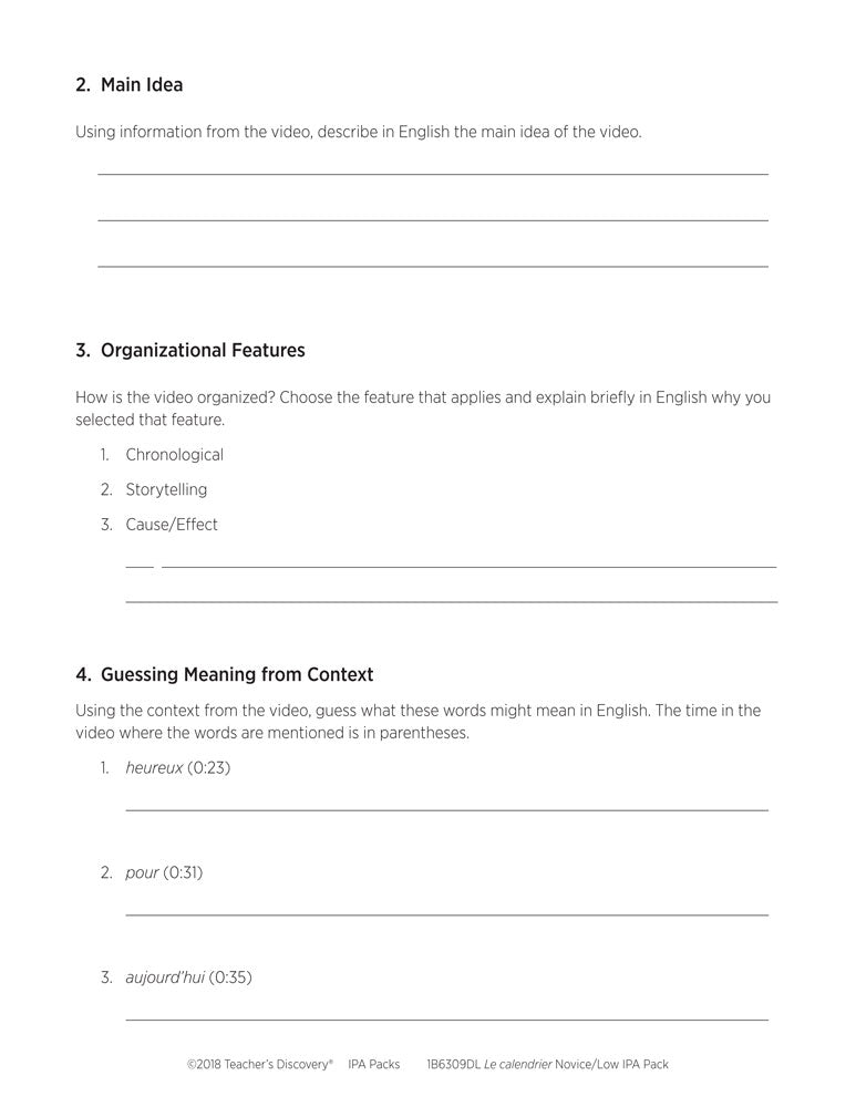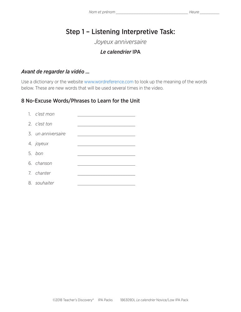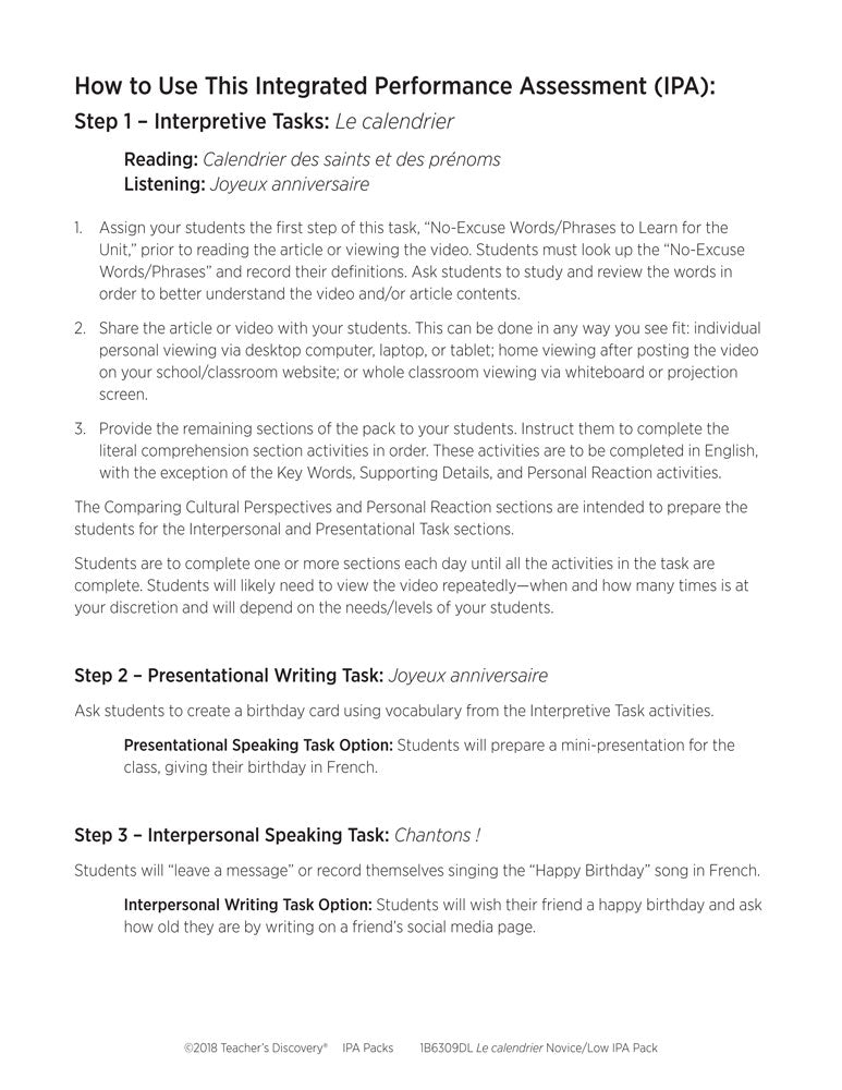 The pack includes step-by-step instructions, and reading and listening comprehension activities that follow the ACTFL model. Complete with an explanation of an IPA and how to use it, and nine Interpretive Tasks that break down the content, increase recognition of key words and phrases, develop context awareness, and promote language usage. In addition, it provides creative options for writing and/or speaking Interpersonal and Presentational Tasks, answer keys, and novice-level rubrics.