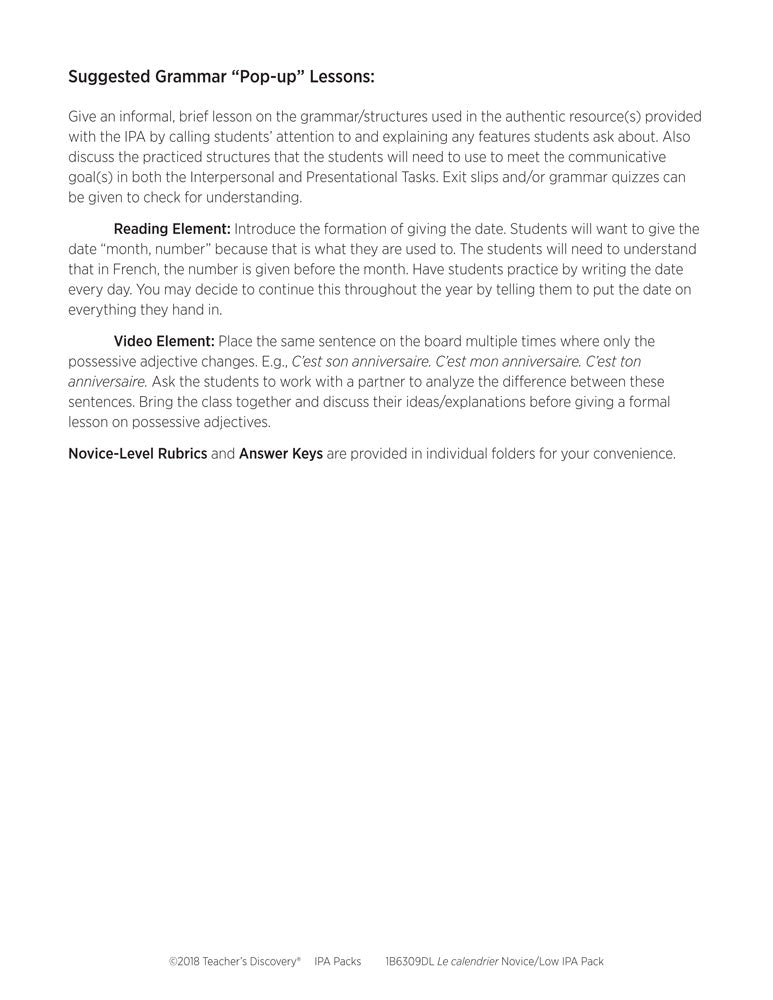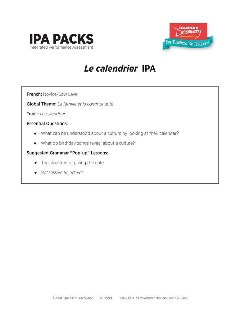 Le calendrier Novice-Low French IPA Pack - DIGITAL RESOURCE DOWNLOAD