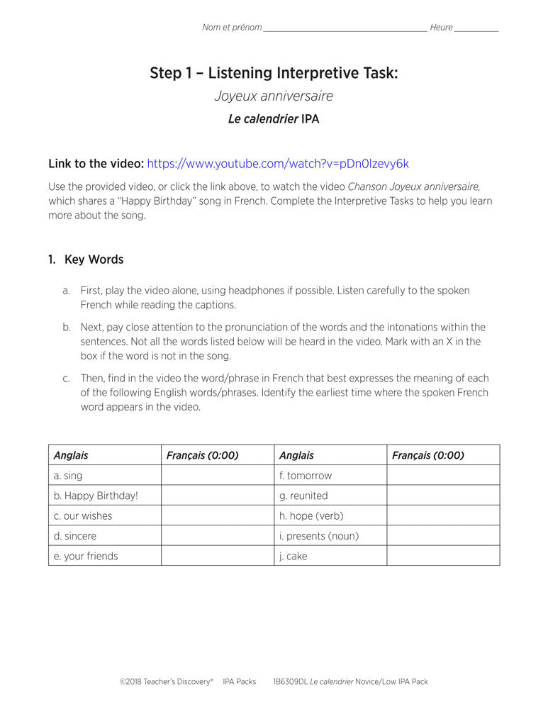 This IPA Download Pack is based on two authentic resources: a website article that features a calendar of the saint names that correspond with each calendar day of the year and a short video Chanson Joyeux anniversaire, which shares a “Happy Birthday” song in 100% French.
