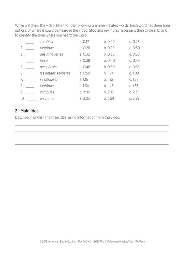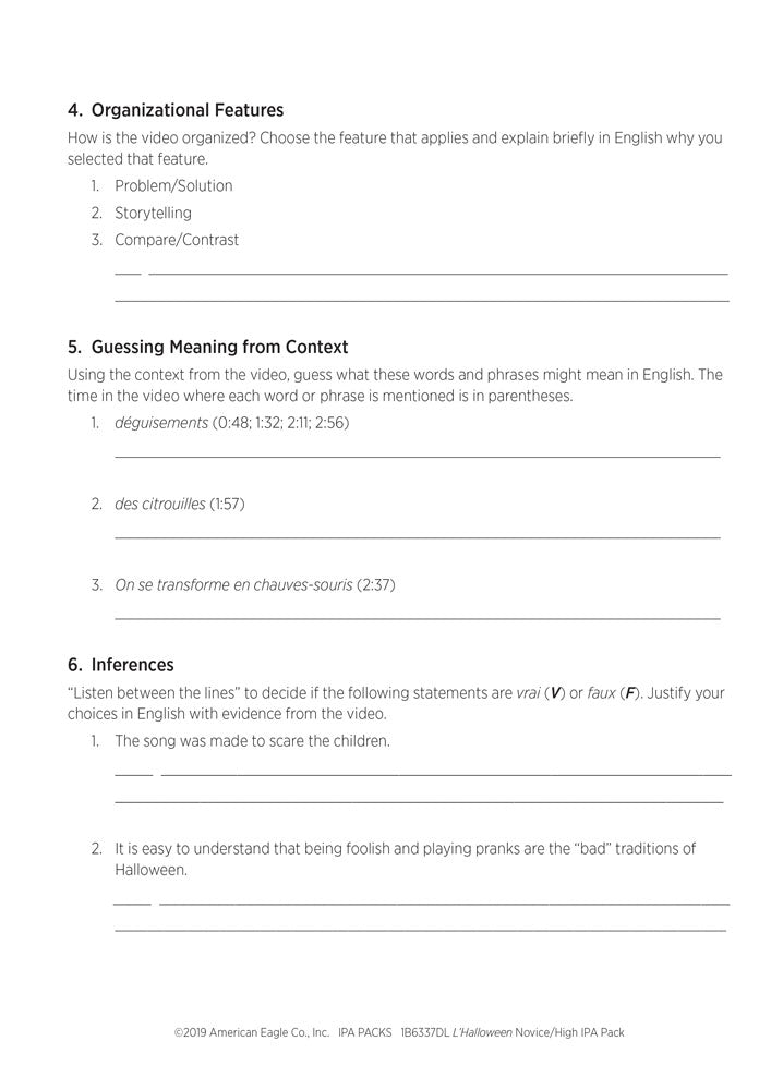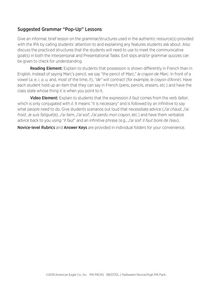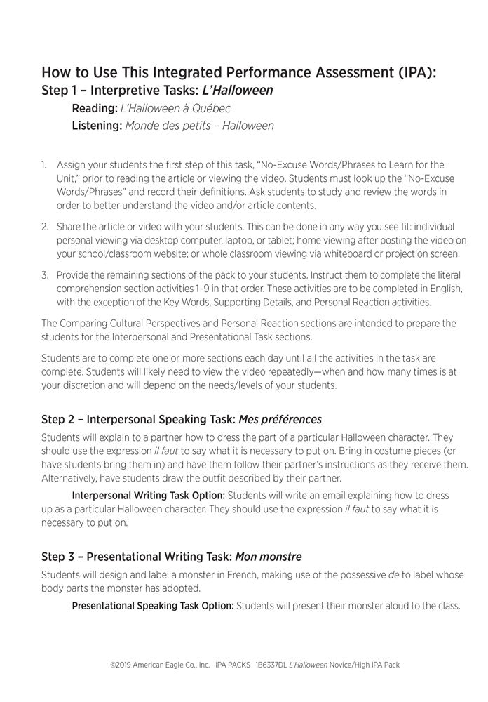 The pack includes step-by-step instructions, and reading and listening comprehension activities that follow the ACTFL model. Complete with an explanation of an IPA and how to use it, and nine Interpretive Tasks that break down the content, increase recognition of key words and phrases, develop context awareness, and promote language usage. In addition, it provides creative options for writing and/or speaking Interpersonal and Presentational Tasks, answer keys, and Novice-level rubrics.