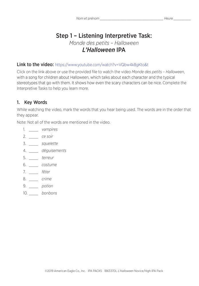 This IPA Download Pack is based on two types of authentic resources: a website that describes Halloween in Quebec, and a short video where children sing a song about Halloween and share the stereotypes that go along with typical characters in 100% French.