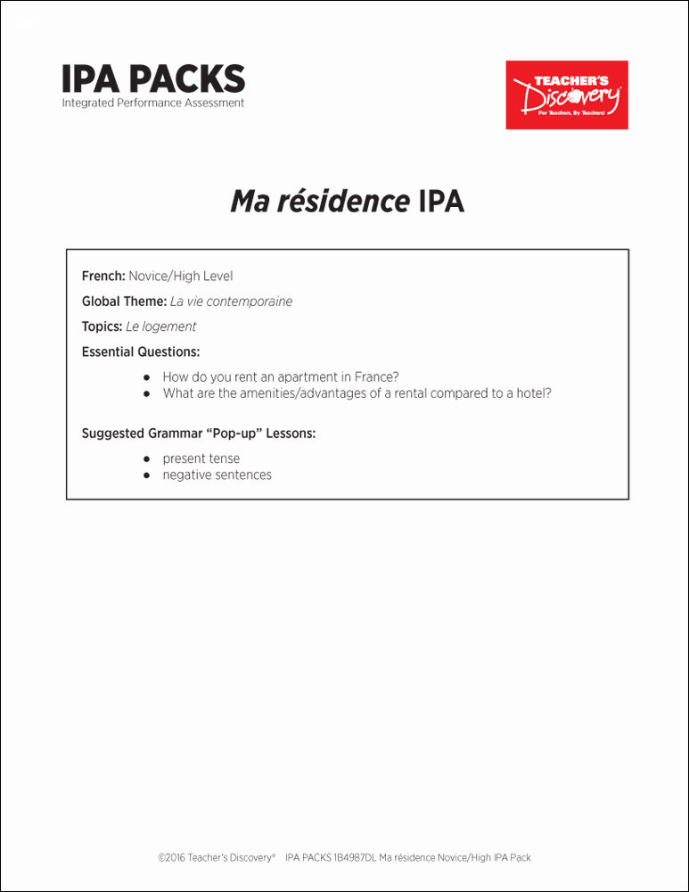 Ma résidence Novice-High French IPA Pack - DIGITAL RESOURCE DOWNLOAD