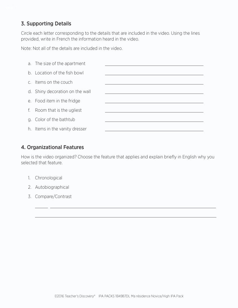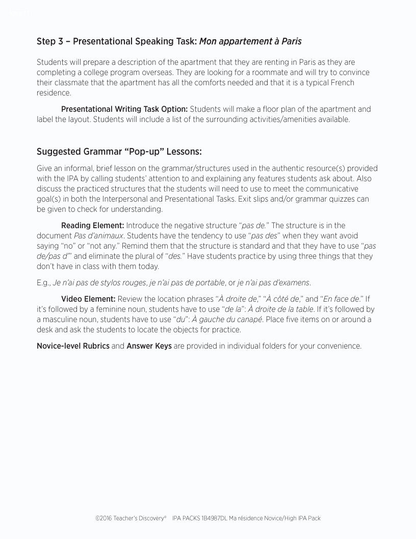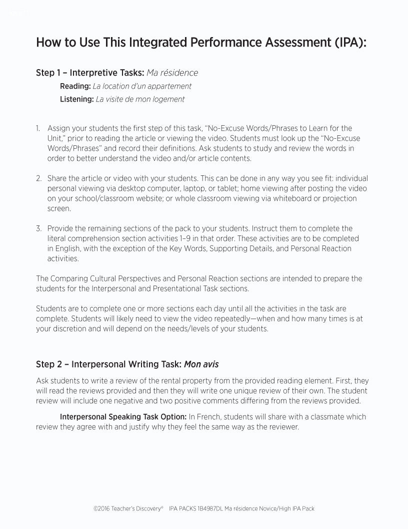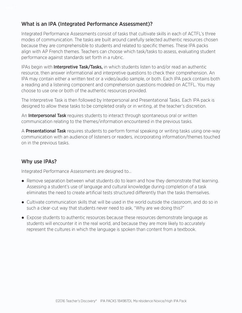 The pack includes step-by-step instructions, and reading and listening comprehension activities that follow the ACTFL model. Complete with an explanation of an IPA and how to use it, and nine Interpretive Tasks that break down the content, increase recognition of key words and phrases, develop context awareness, and promote language usage. In addition, it provides creative options for writing and/or speaking Interpersonal and Presentational Tasks, answer keys, and Novice/High-Level rubrics.