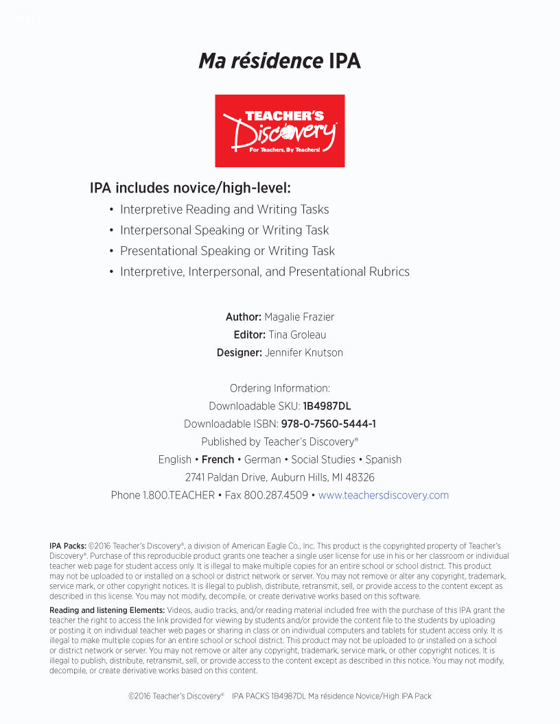 Ma résidence Novice-High French IPA Pack - DIGITAL RESOURCE DOWNLOAD is backordered and will ship as soon as it is back in stock.