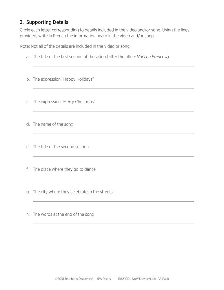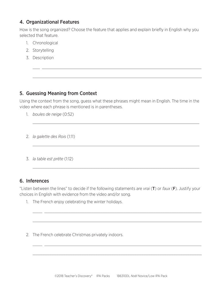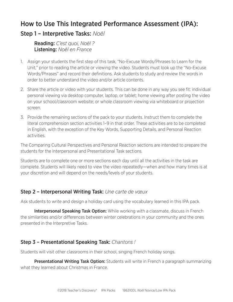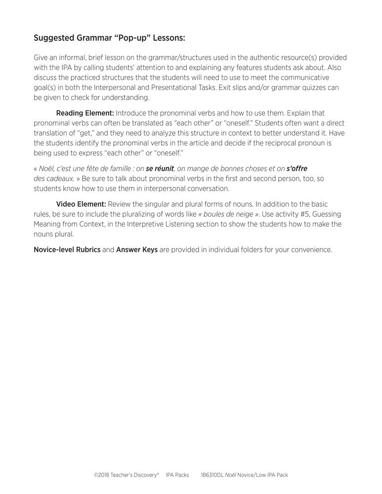 The pack includes step-by-step instructions, and reading and listening comprehension activities that follow the ACTFL model. Complete with an explanation of an IPA and how to use it, and nine Interpretive Tasks that break down the content, increase recognition of key words and phrases, develop context awareness, and promote language usage. In addition, it provides creative options for writing and/or speaking Interpersonal and Presentational Tasks, answer keys, and novice-level rubrics.
