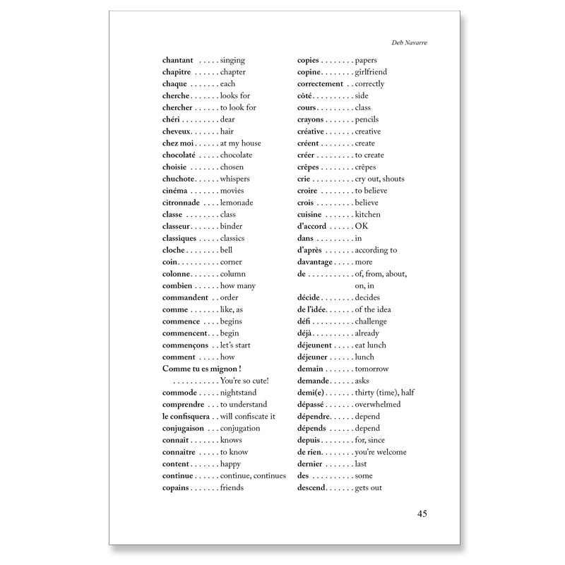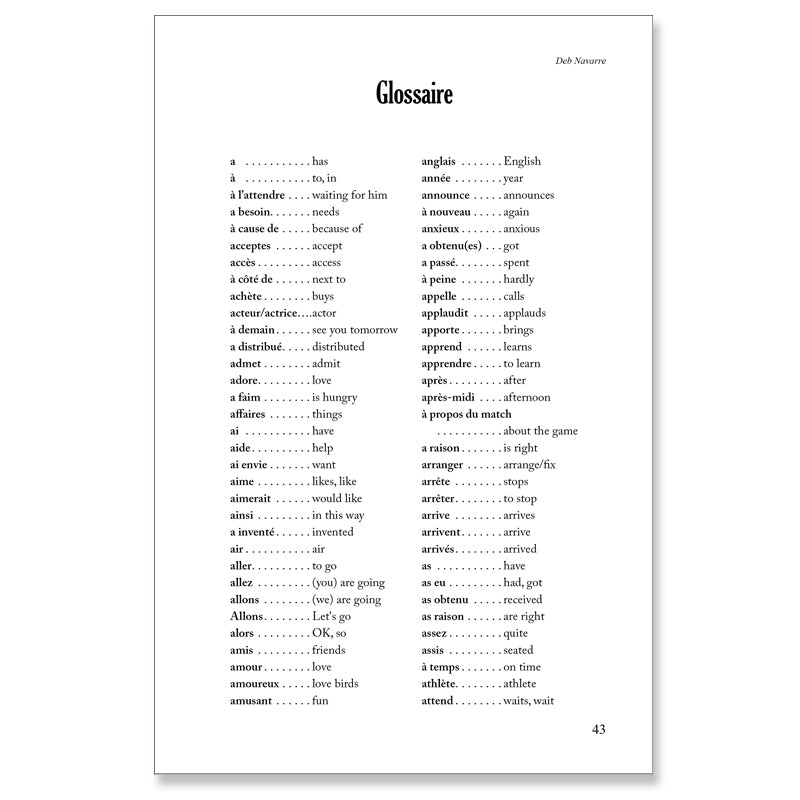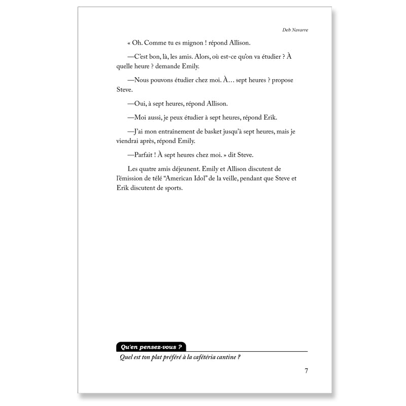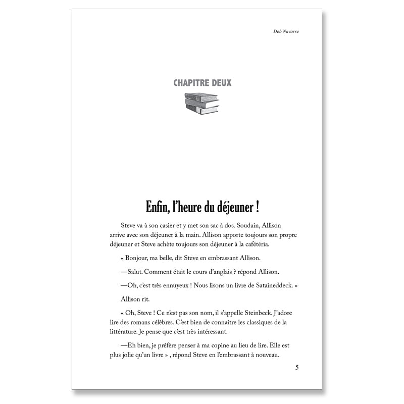 Use Deb Navarre readers with your Level One French classes or as review with higher levels. This highly readable series is written almost entirely in the present tense, and each one is supported by a thorough glossary containing all the structures and vocabulary used in each reader. Comprehension questions in French at the end of each chapter help students check their understanding, plus a What Do You Think? question for oral or written completion. The best way to encourage reading in any language is to provide interesting content. Deb Navarre readers are full of themes teens want to read about!