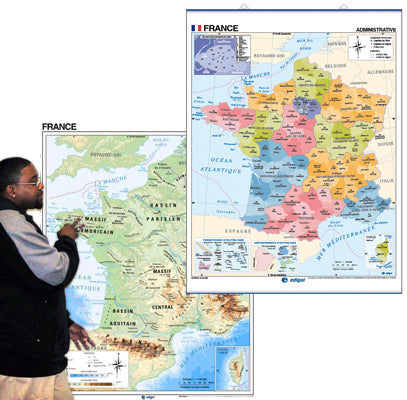 The French map of France reflects the "New Territory Organization." This colorful, two-sided wall map features physical characteristics on one side and political information on the other. Physical side shows mountain ranges, lakes, rivers and other geographical features. Political side shows capitals, principal cities, and towns. Its travel-friendly form is easily rolled and taken from room to room.