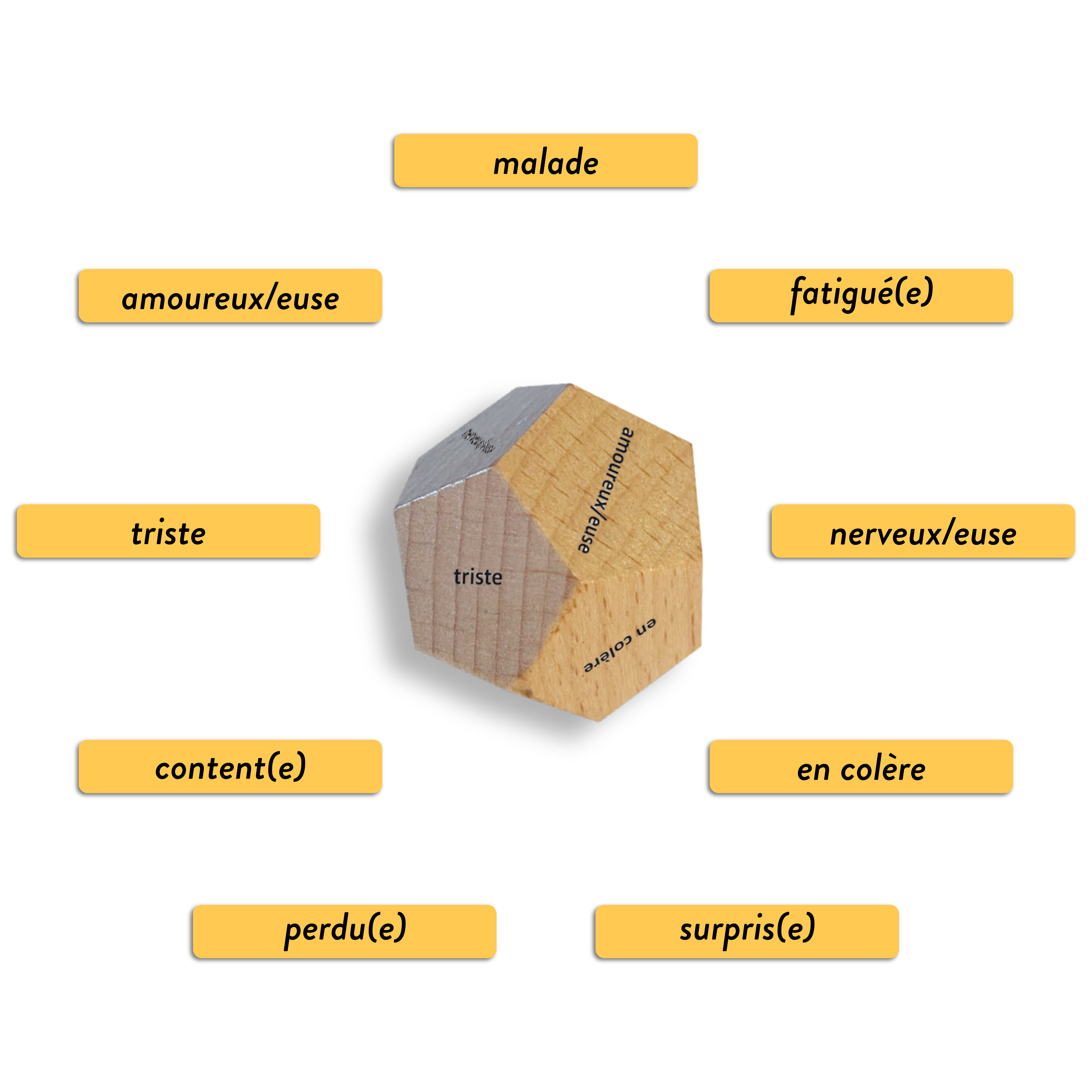 Émotions en jeu is a 12-sided die that helps you randomize nine essential vocabulary words any time an emotion is needed in class.