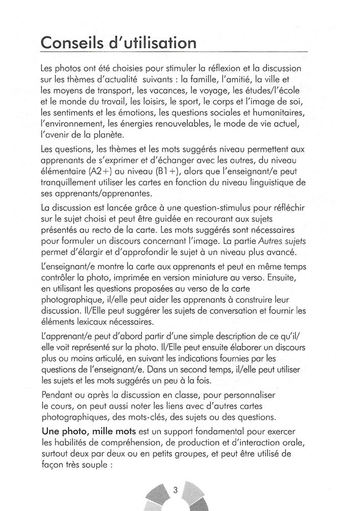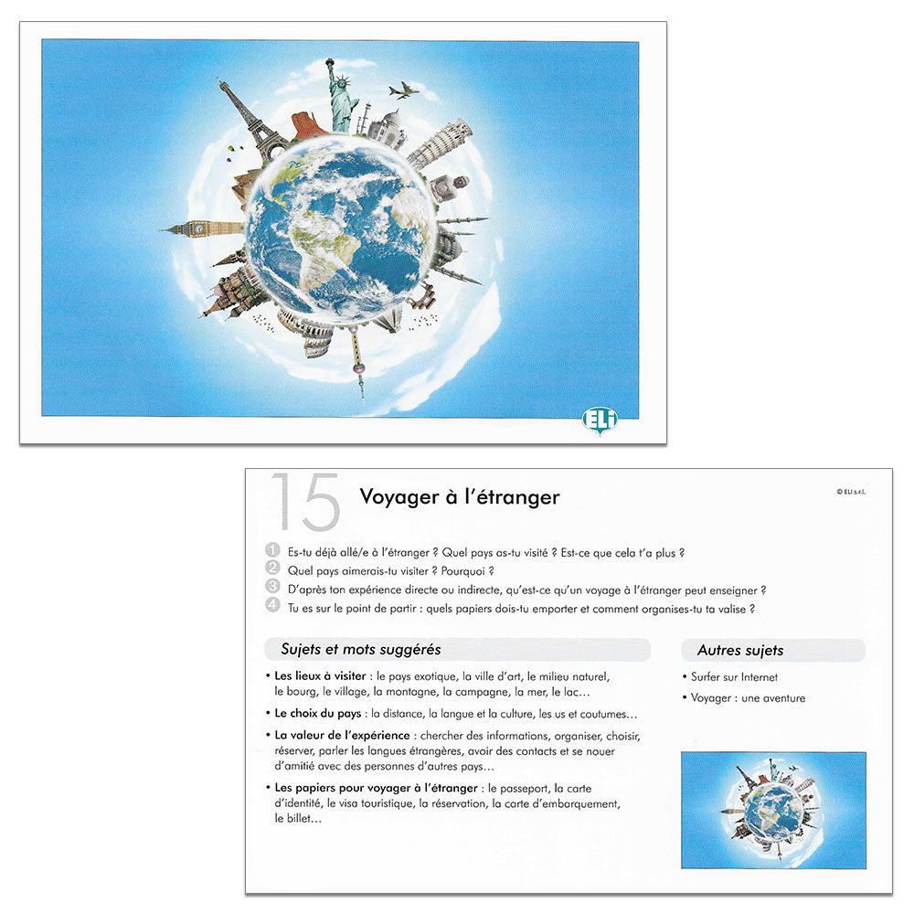 Listening, speaking, and oral interaction skills are developed around 75 images pertaining to the environment, society, and personal experiences that encourage learners to express themselves, converse with others, and share ideas. An ideal didactic tool for small group or partner work. All cards have a meaningful photograph presenting topical issues of general interest. On the back side are a series of questions related to the topic presented, vocabulary fields, and suggestions that provide helpful stimuli for discussion and conversation, plus additional topics with which the discussion can be extended.