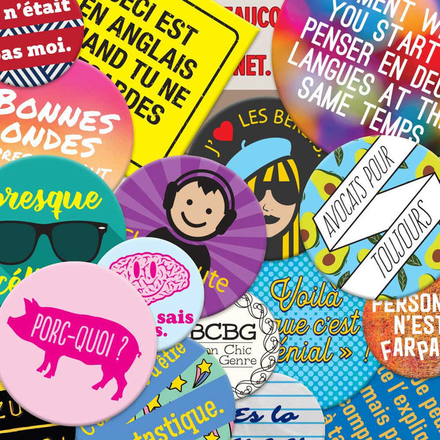 Everyone will be talking about French class when your students wear these buttons around the school! The assortment is full of cool designs, fun text like “I do all my own stunts” and “This is in English when you’re not looking,” and lots of the mini-sized buttons kids love. Forty different styles, ranging in size from 1 inch to 2 inches across. Translation sheet included.