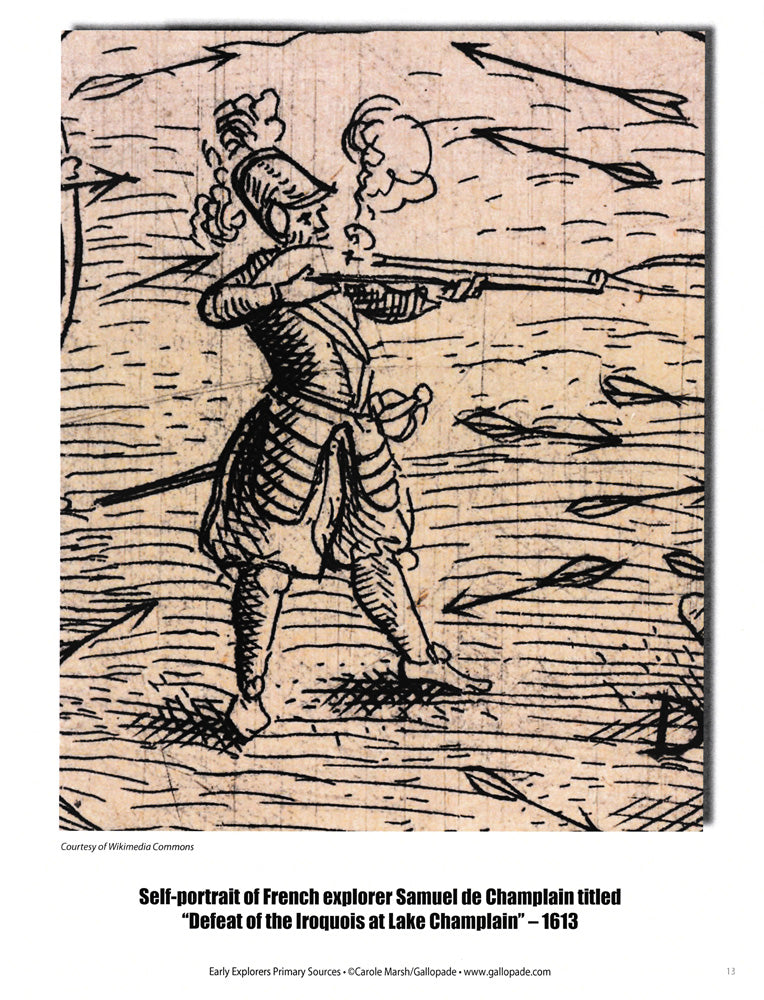 - Self-portrait of French explorer Samuel de Champlain titled Defeat of the Iroquois at Lake Champlain – 1613